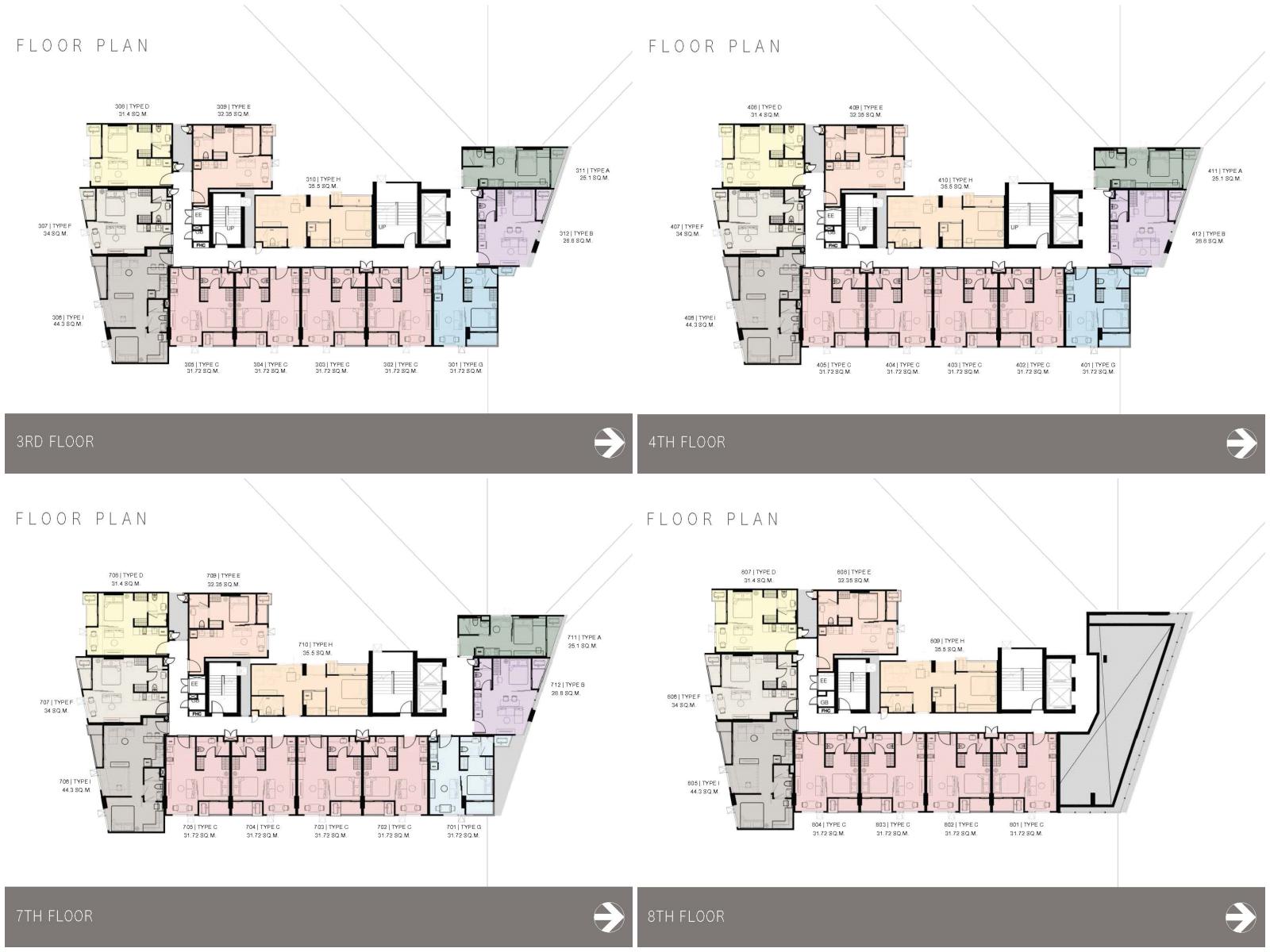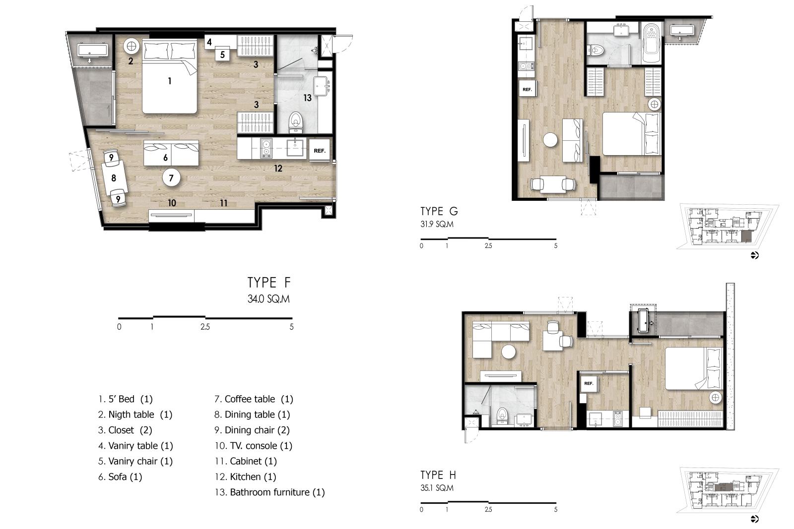 ห้อง Type F, G, H และ I พื้นที่ใช้สอย 34.00 - 44.30 ตารางเมตร