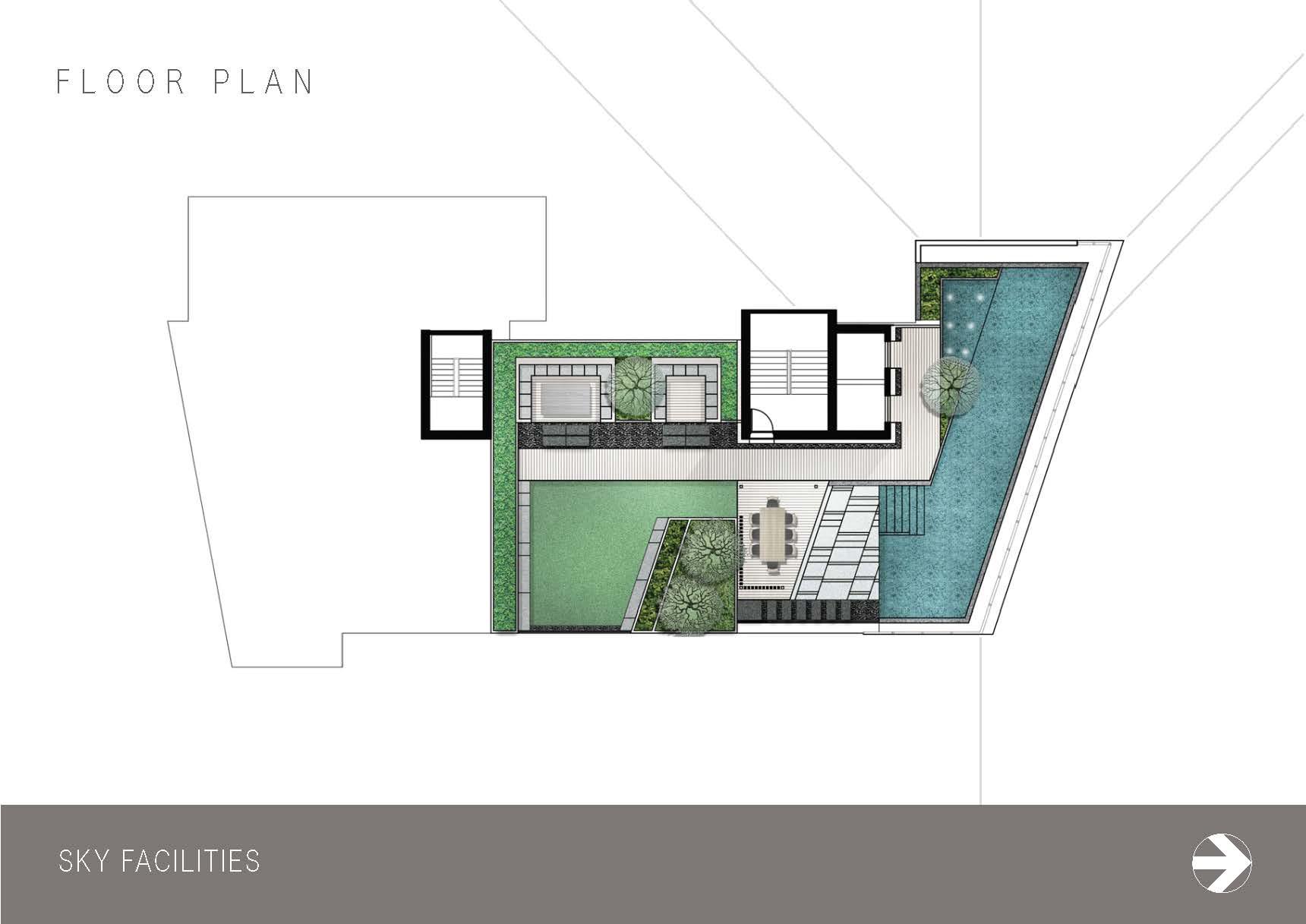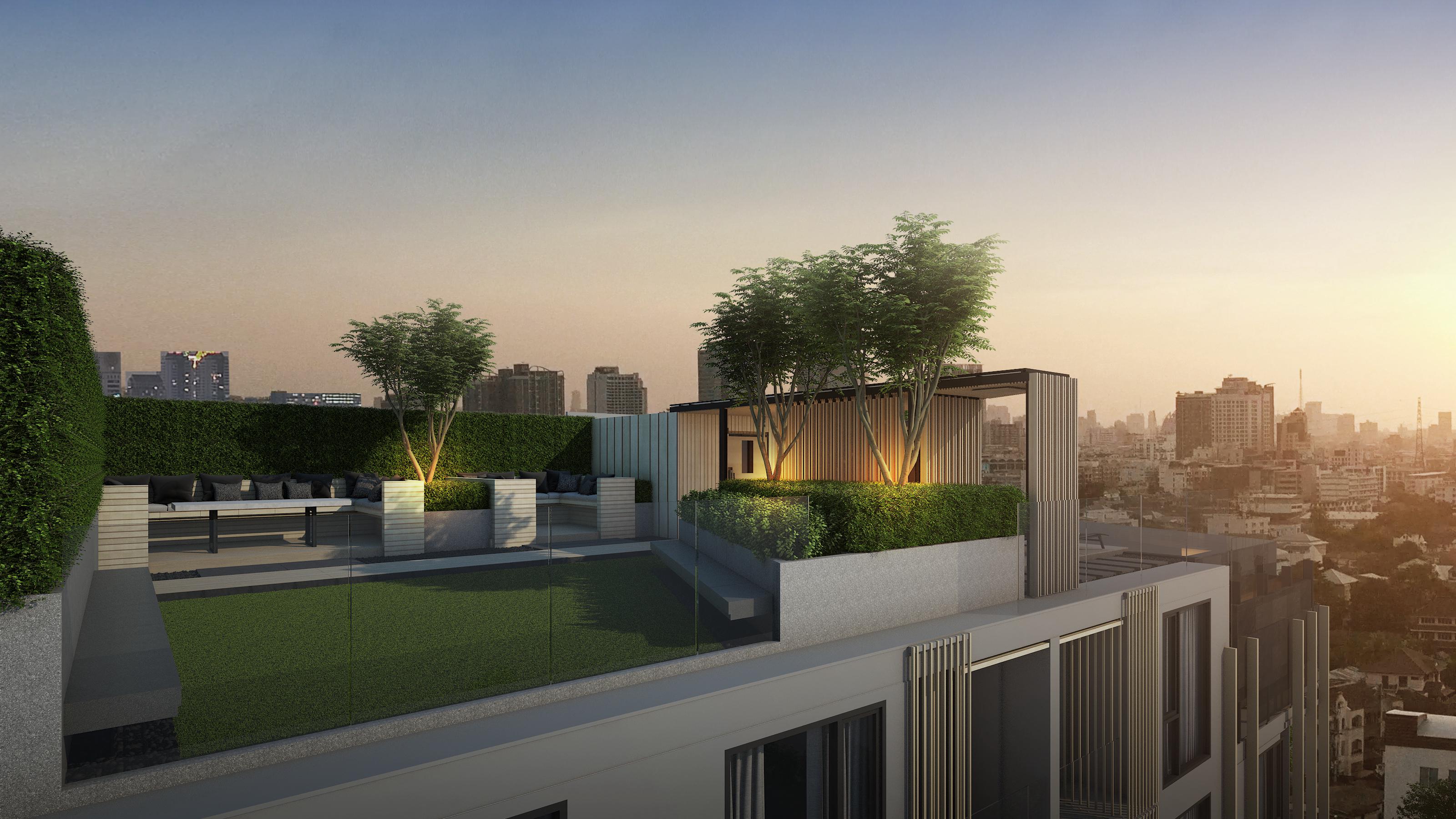 ขยับขึ้นมาต่อที่ชั้นดาดฟ้า ซึ่งจะเป็นพื้นที่ส่วนกลางทั้งหมด ประกอบด้วย 'สวนหย่อม' ที่ตั้งอยู่ทางทิศใต้ และ 'สระว่ายน้ำ' พร้อมห้องสำหรับเปลี่ยนเสื้อผ้า ที่ตั้งอยู่ทางเหนือ ทำให้เราสามารถใช้บริการท่ามกลางบรรยากาศร่มรื่นได้เกือบตลอดวัน และเชื่อมต่อความสุขด้วย Terrace ที่นั่งพักผ่อนสำหรับวันผ่อนคลาย