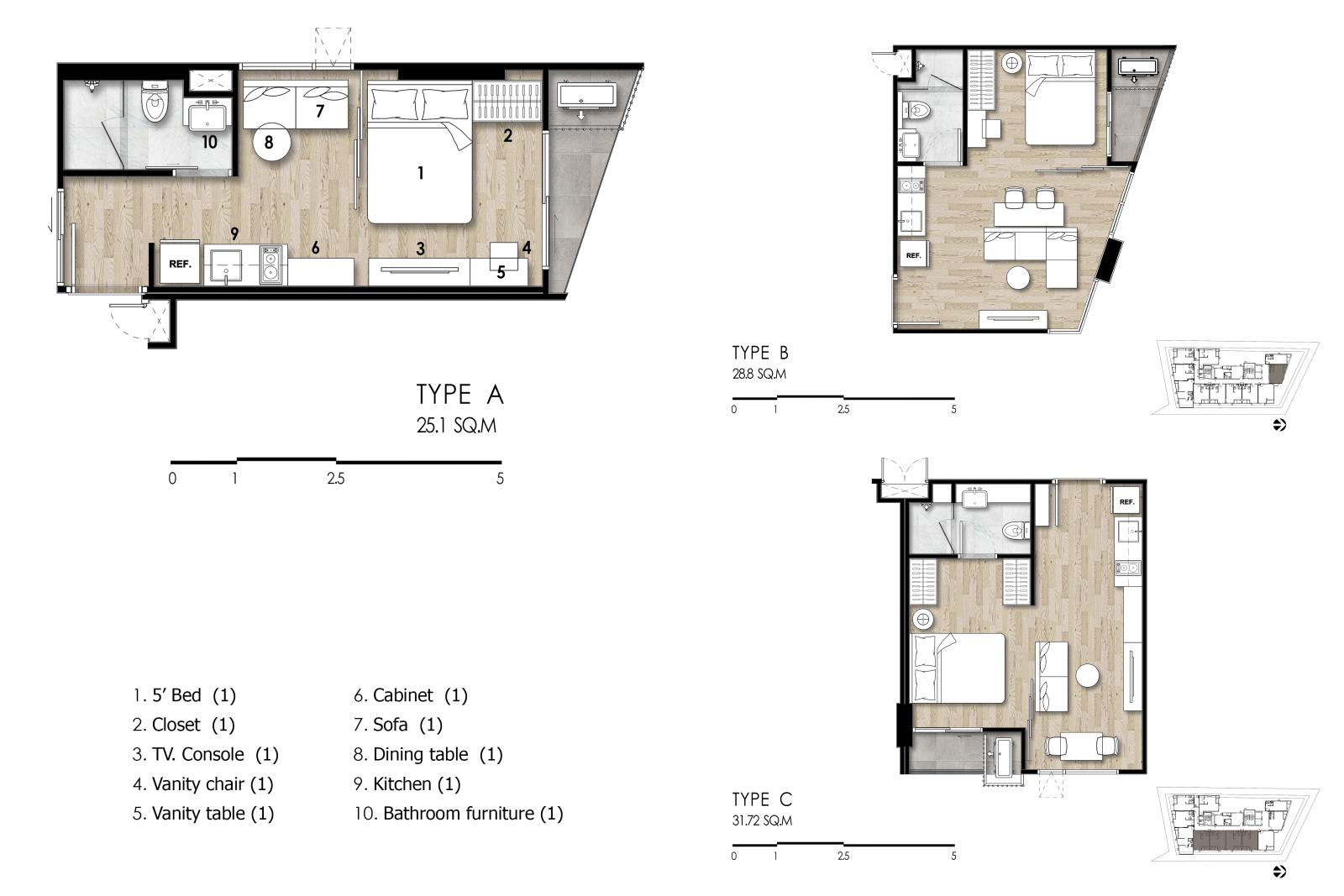 โดยแต่ละ Type ของห้องจะแตกต่างกันเพียงรูปแบบการจัดวาง และรายการเฟอร์นิเจอร์บางส่วนเท่านั้น ซึ่งผู้พักอาศัยสามารถเลือกการจัดวางให้เหมาะความความชอบของตัวเองได้