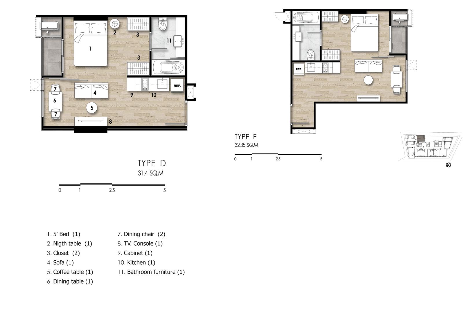 ห้อง Type D และ E พื้นที่ใช้สอย 31.40 - 32.35 ตารางเมตร