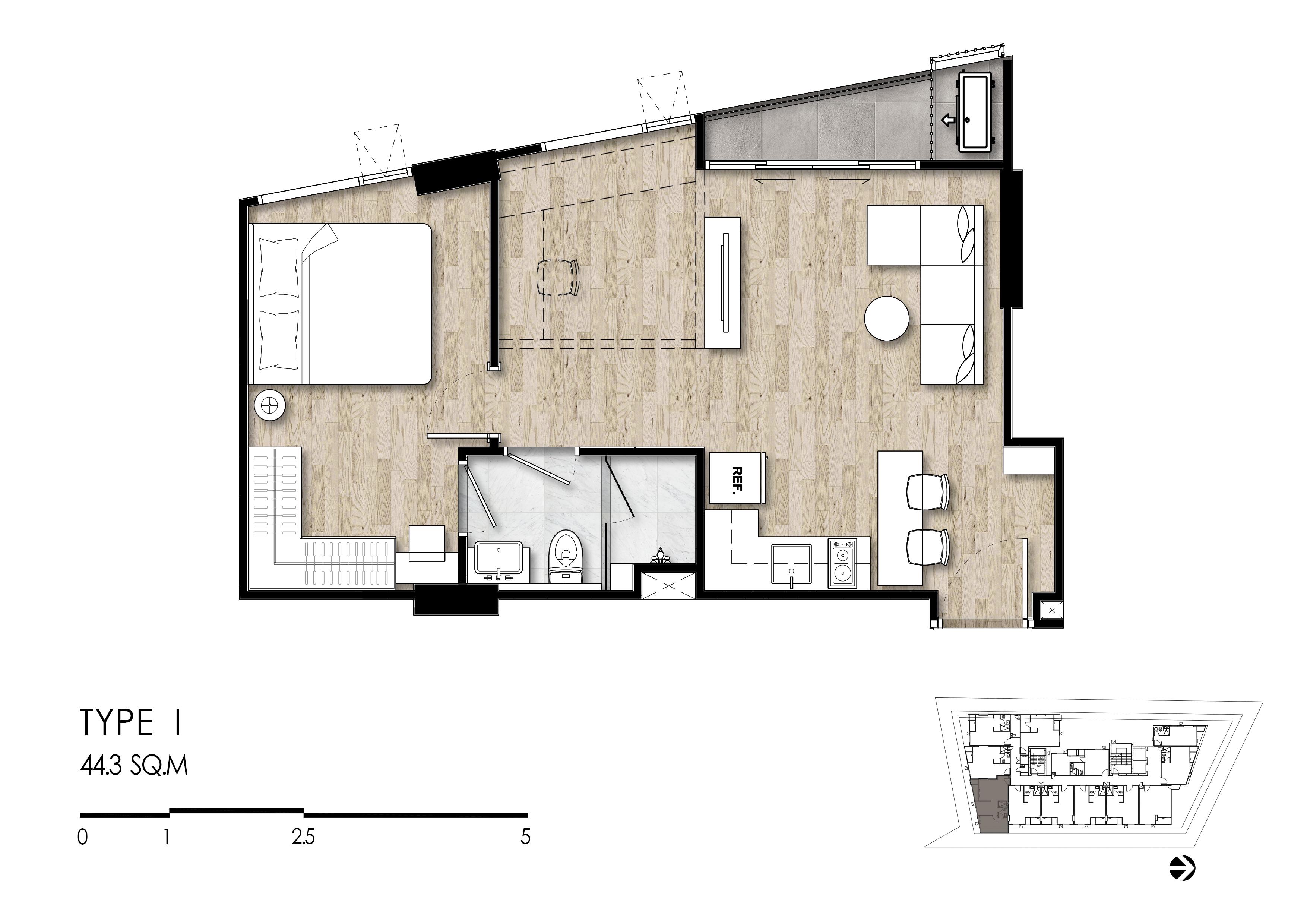 - 1 Bedroom Plus พื้นที่ใช้สอย 44.30 ตารางเมตร จำนวน 7 ยูนิต