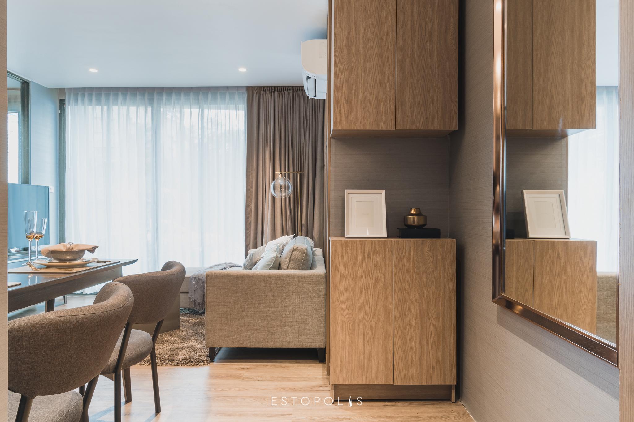 สิ่งแรกที่สะดุดตาตั้งแต่เปิดประตูห้องคือ ตู้เก็บของบิลท์อินลายไม้ บานเปิด-ปิด Soft close โดยตู้ชั้นบนเราอาจไว้สำหรับเก็บของที่ต้องพกออกไปข้างนอกด้วยประจำเพื่อความสะดวกเวลาหยิบใช้งาน ส่วนตู้ด้านล่างออกแบบให้เหมาะต่อการเก็บรองเท้า สามารถวางเรียงได้ 3 - 4 คู่ หรือใครที่ชอบโชว์ของสะสม ของตกแต่งห้องก็สามารถนำมาตั้งไว้บนตู้นี้ได้