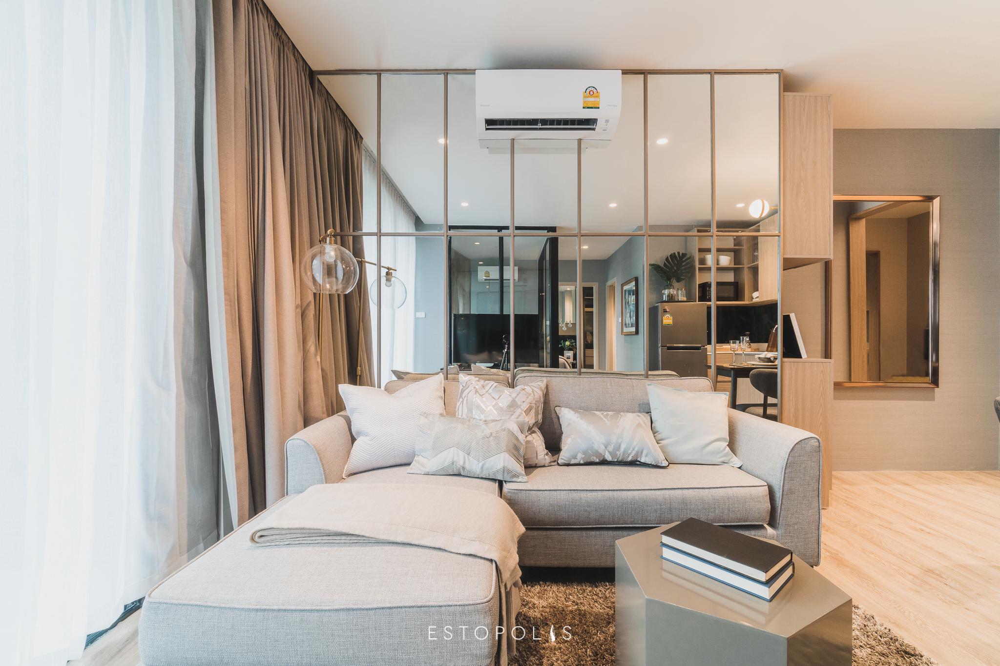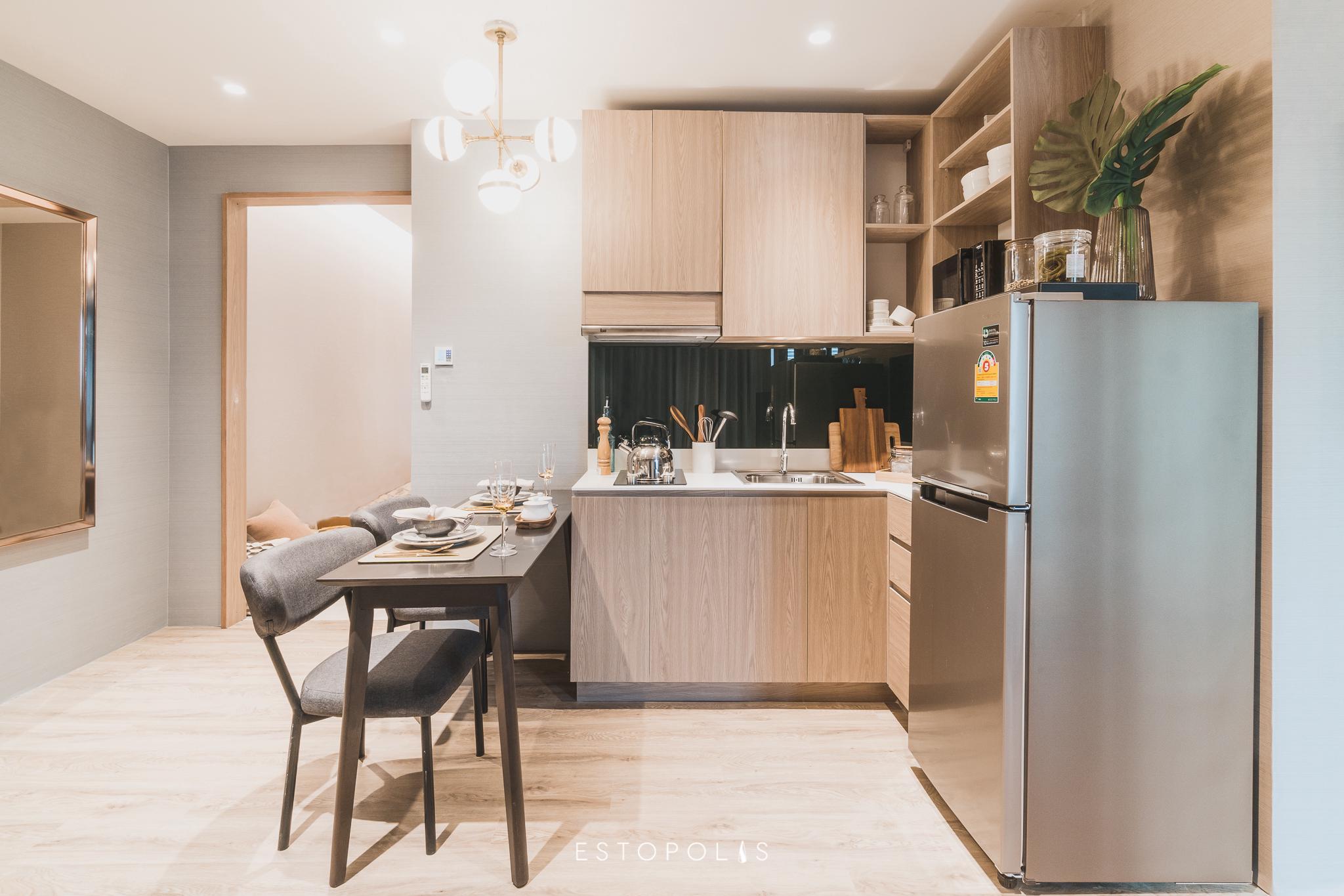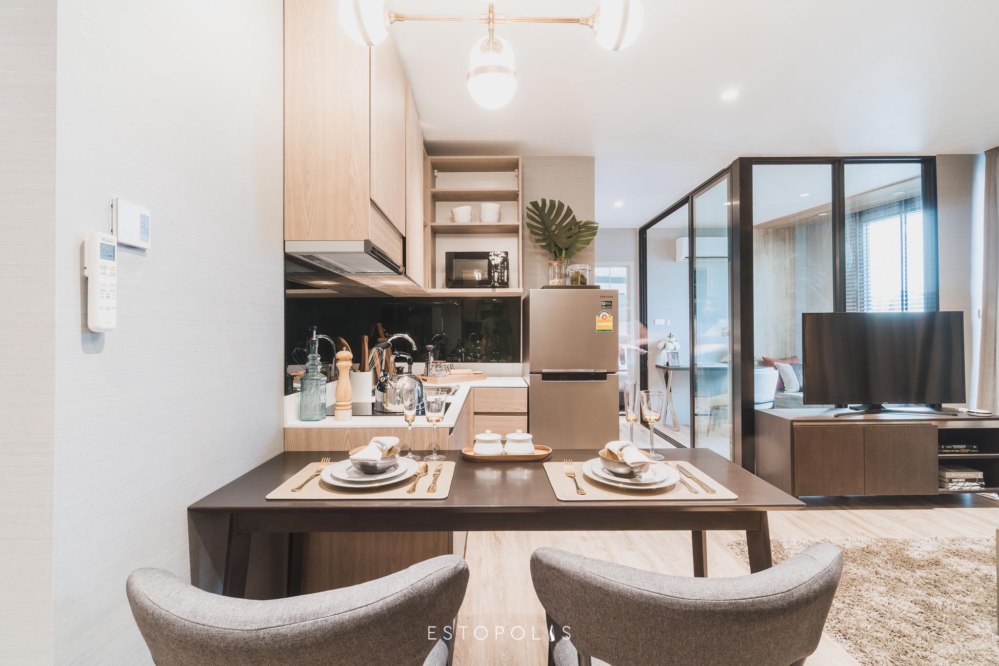 เมื่อเข้ามาภายในห้องจะเจอกับห้องนั่งเล่น และทางซ้ายมือจะเป็นห้องครัวแบบเปิด พื้นห้องทั้งหมดถูกปูด้วยลามิเนตลายไม้สีอ่อนที่ให้ความสวยงาม ทำให้ห้องดูกว้างและสบายตา บวกกับเพดานสูง 2.5 เมตรและแสงไฟวอร์มไลท์ (Warm Light) ที่ส่องลงมากระทบตัวห้อง ยิ่งทำให้ห้องดูโปร่งมากขึ้นไปอีก