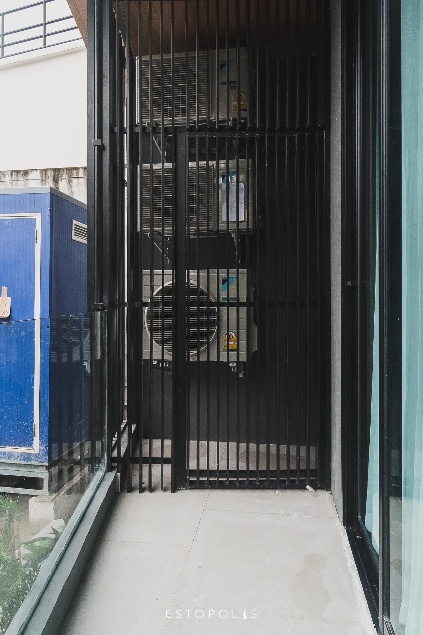 อีกฝั่งวางคอมเพลสเซอร์แอร์ในลักษณะแขวนหันหน้าเข้าหาระเบียง แล้วค่อยปิดทับด้วยระแนงเหล็กสีดำ เพื่อความสวยงาม ดูเป็นสัดส่วน ทั้งยังหมดปัญหาเรื่องผ้าช้า เหมาะสำหรับไลฟ์สไตล์คนทำงานที่นิยมตากผ้าทิ้งไว้ในตอนกลางคืน