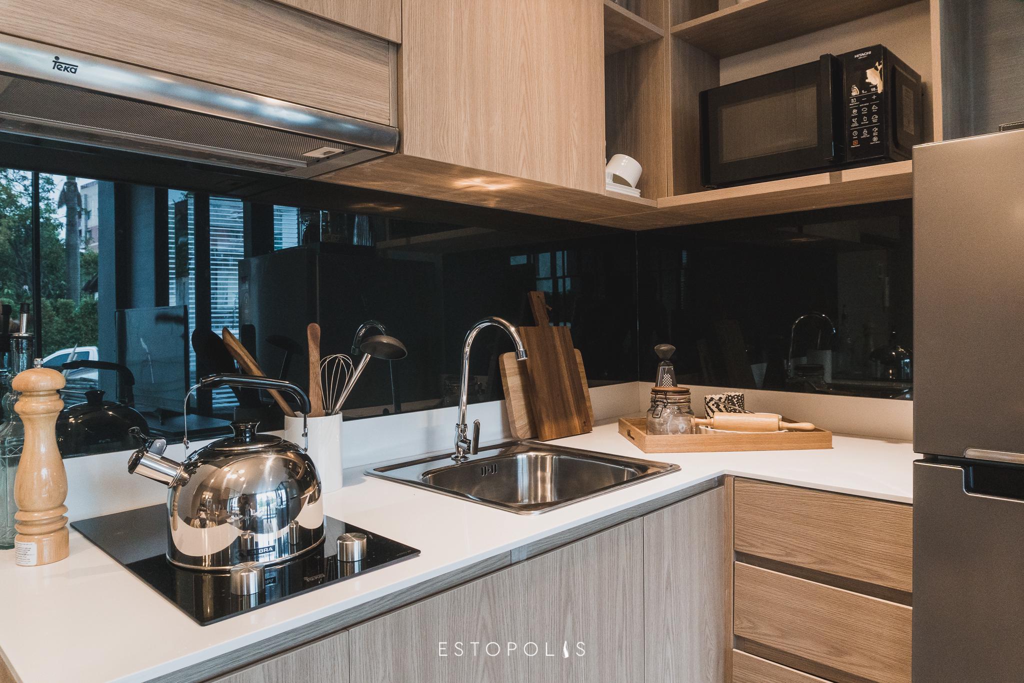 ด้านชุดครัวบิลท์อิน (Built in) จะยังคงคุมคอนเซปต์ของห้องไว้ด้วยเคาน์เตอร์ครัวลายไม้ แล้ววางท็อปครัวด้วยหินสังเคราะห์สีขาว ที่ทนทานต่อการใช้งาน และมีการปิดทับผนังด้านหลังด้วยกระเบื้องสีดำทำเป็น Backsplash เพื่อให้ง่ายต่อการเช็ดล้างทำความสะอาด