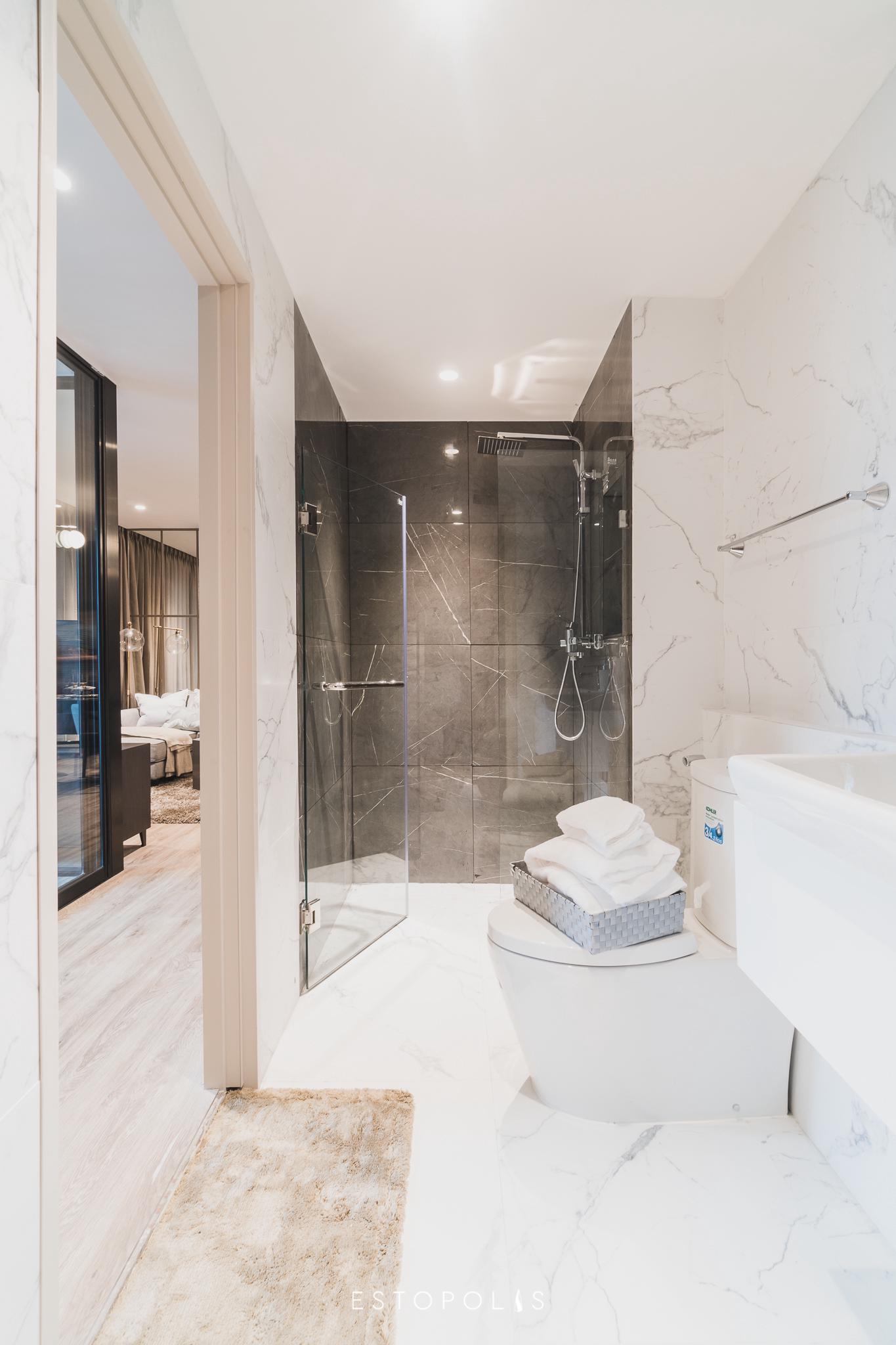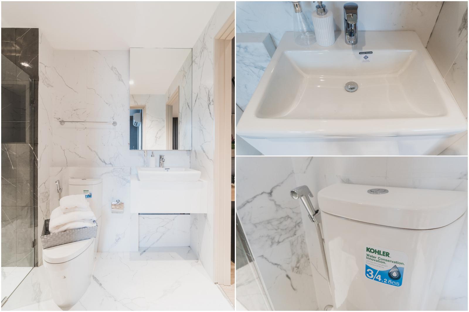 ใต้อ่างล้างหน้าทำช่องว่างสำหรับรองรับอุปกรณ์ที่ใช้ในห้องน้ำ ส่วนโถสุขภัณฑ์เป็นแบบ Dual Flush ช่วยในการประหยัดน้ำ และติดตั้งสายฉีดชำระกับที่ใส่กระดาษทิชชู่ไว้ด้านข้าง สะดวกต่อการใช้งาน
