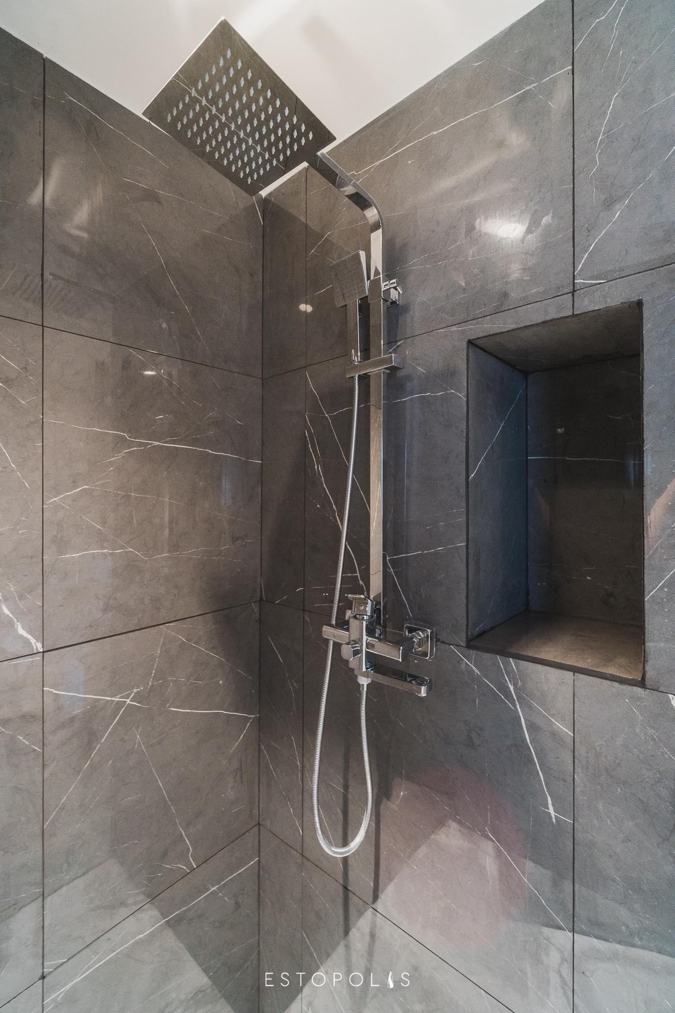 สำหรับฝั่งโซนเปียดจะกรุผนังด้วยกระเบื้องลายหินอ่อนสีดำ เพื่อป้องกันการเกิดคราบสกปรก พร้อมติดตั้งชุดฝักบัวแบบ Rain Shower และ Hand Shower ให้ ซึ่งทางโครงการ The Teak Sathorn-Lumpini ได้ทำระบบทำน้ำอุ่นให้ในตัว ข้างกันเป็นช่องวางของแบบ Drop Wall เอื้อต่อการหยิบจับสบู่,ยาสระผม และของใช้โดยไม่เปลืองพื้นที่ใช้สอย