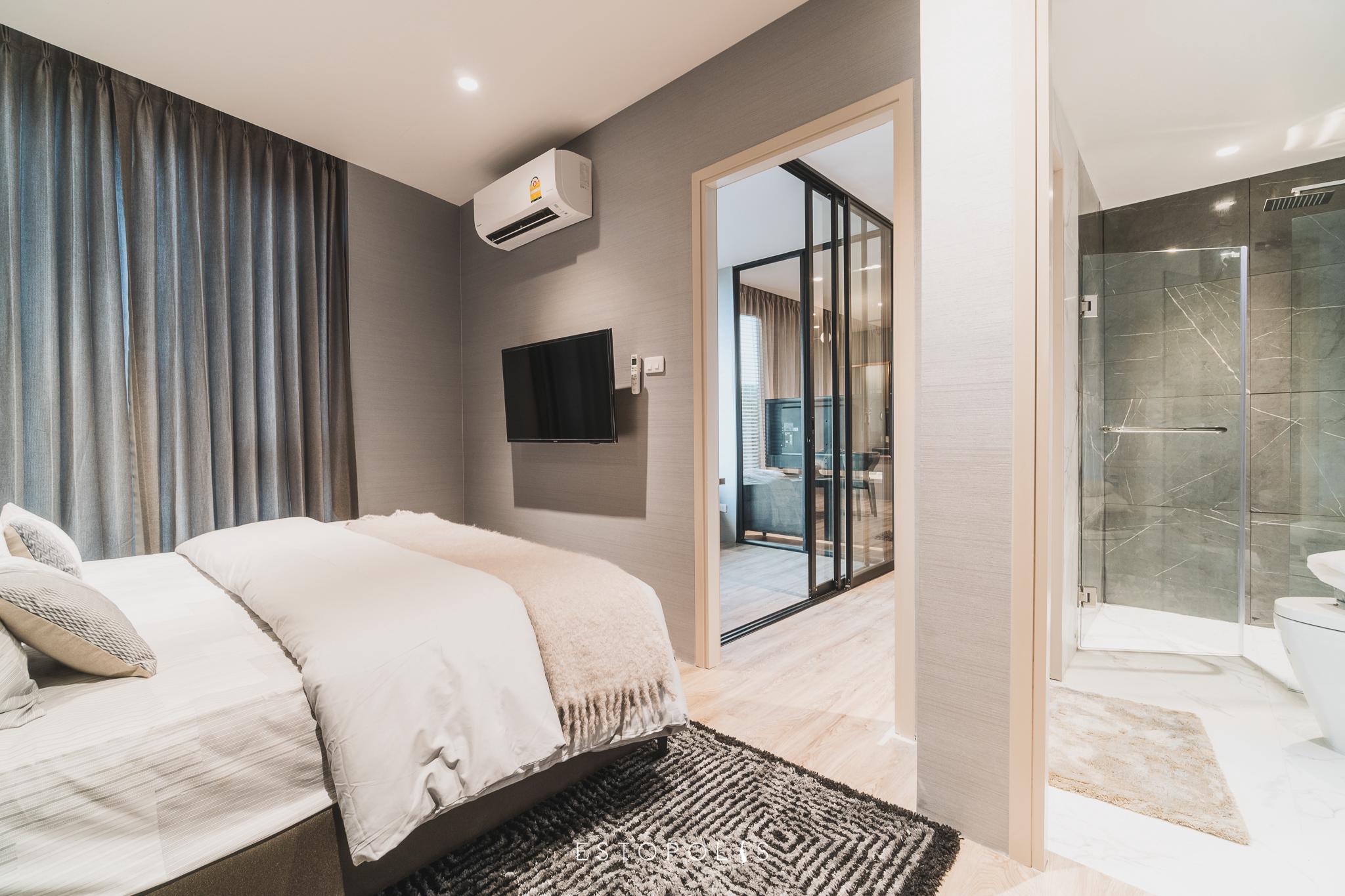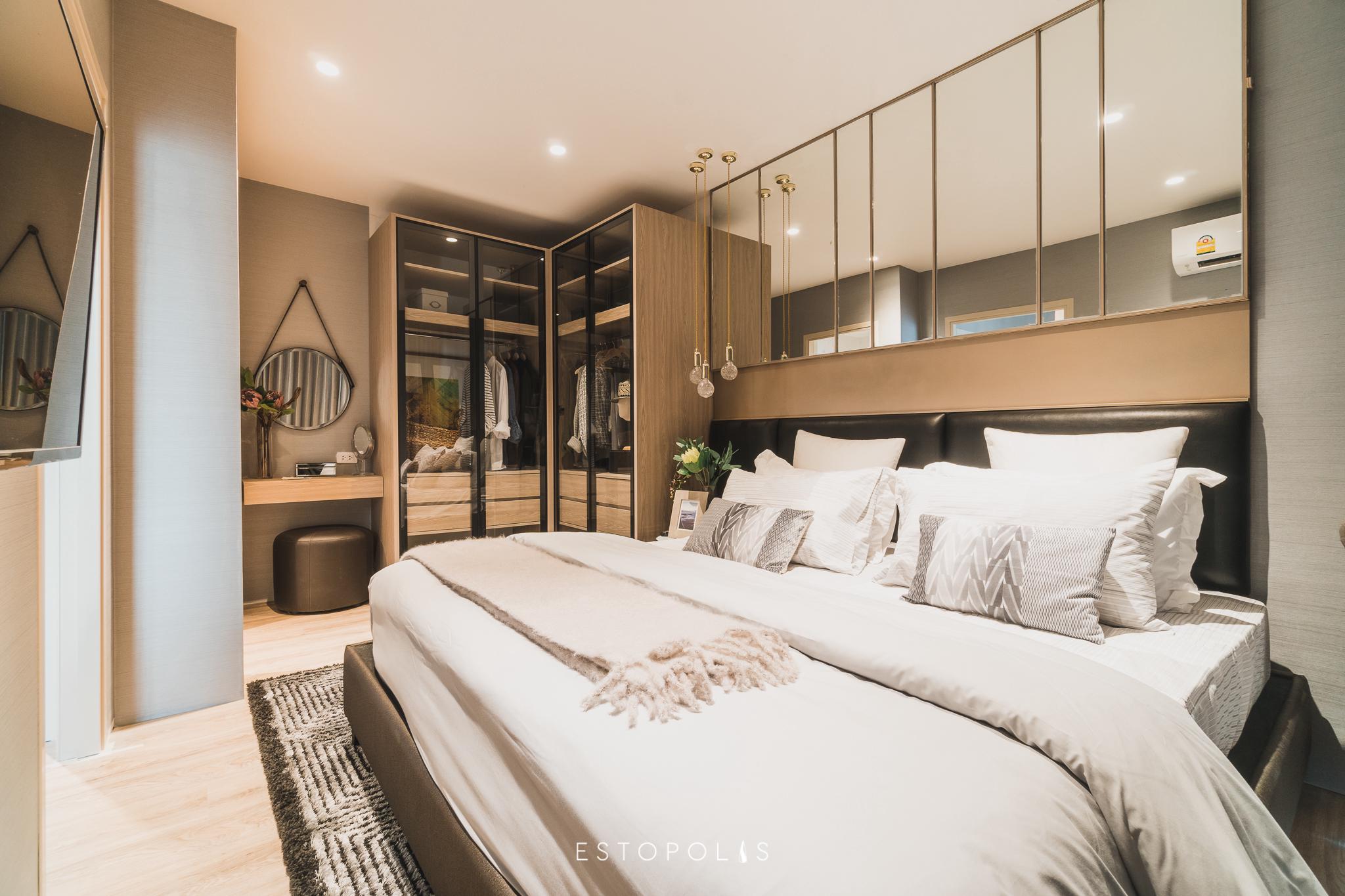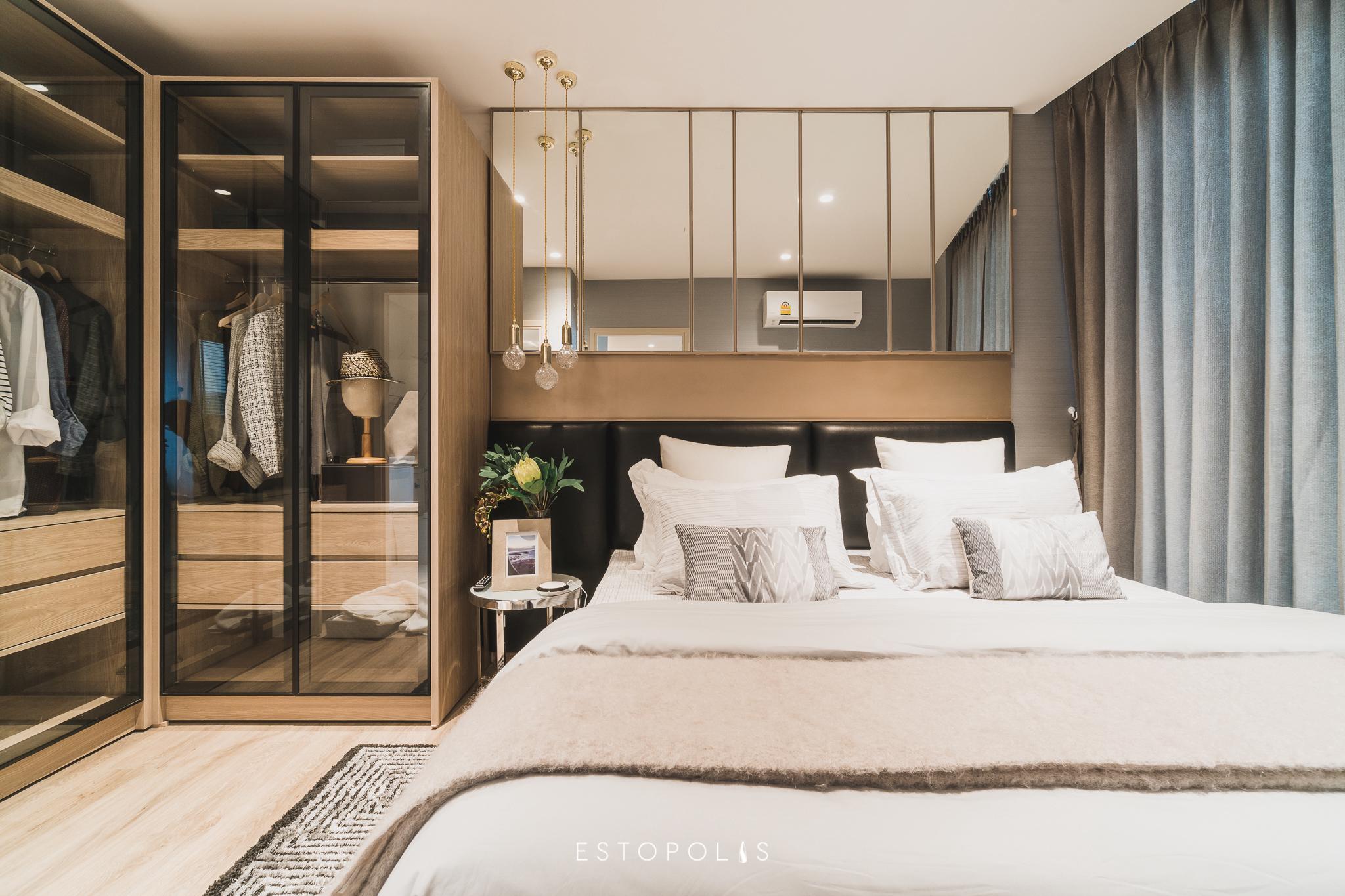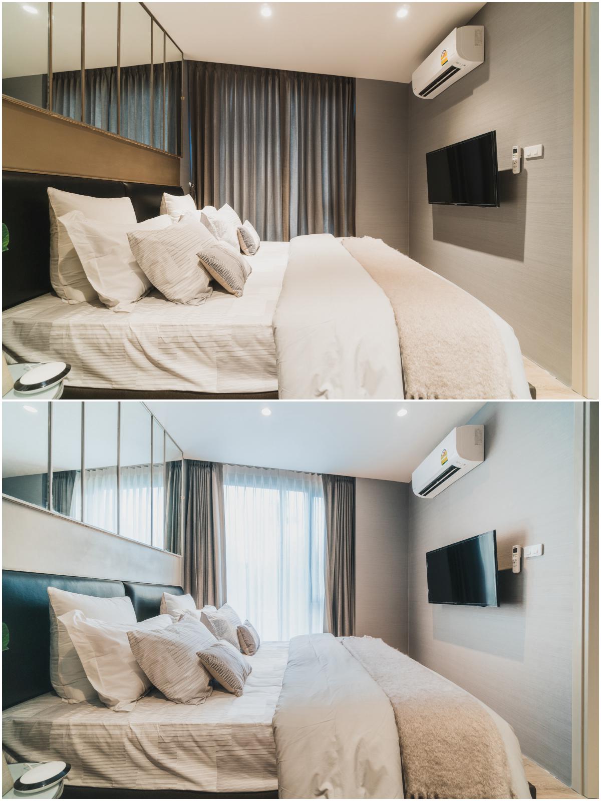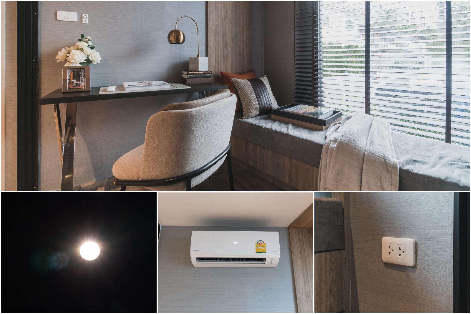 บริเวณปลายเตียง ทางโครงการจะวางระบบสำหรับการติดตั้งโทรทัศน์แบบแขวนให้เรียบร้อย ส่วนด้านบนเป็นตำแหน่งของเครื่องปรับอากาศที่กระจายความเย็นไปทั่วทั้งห้อง
