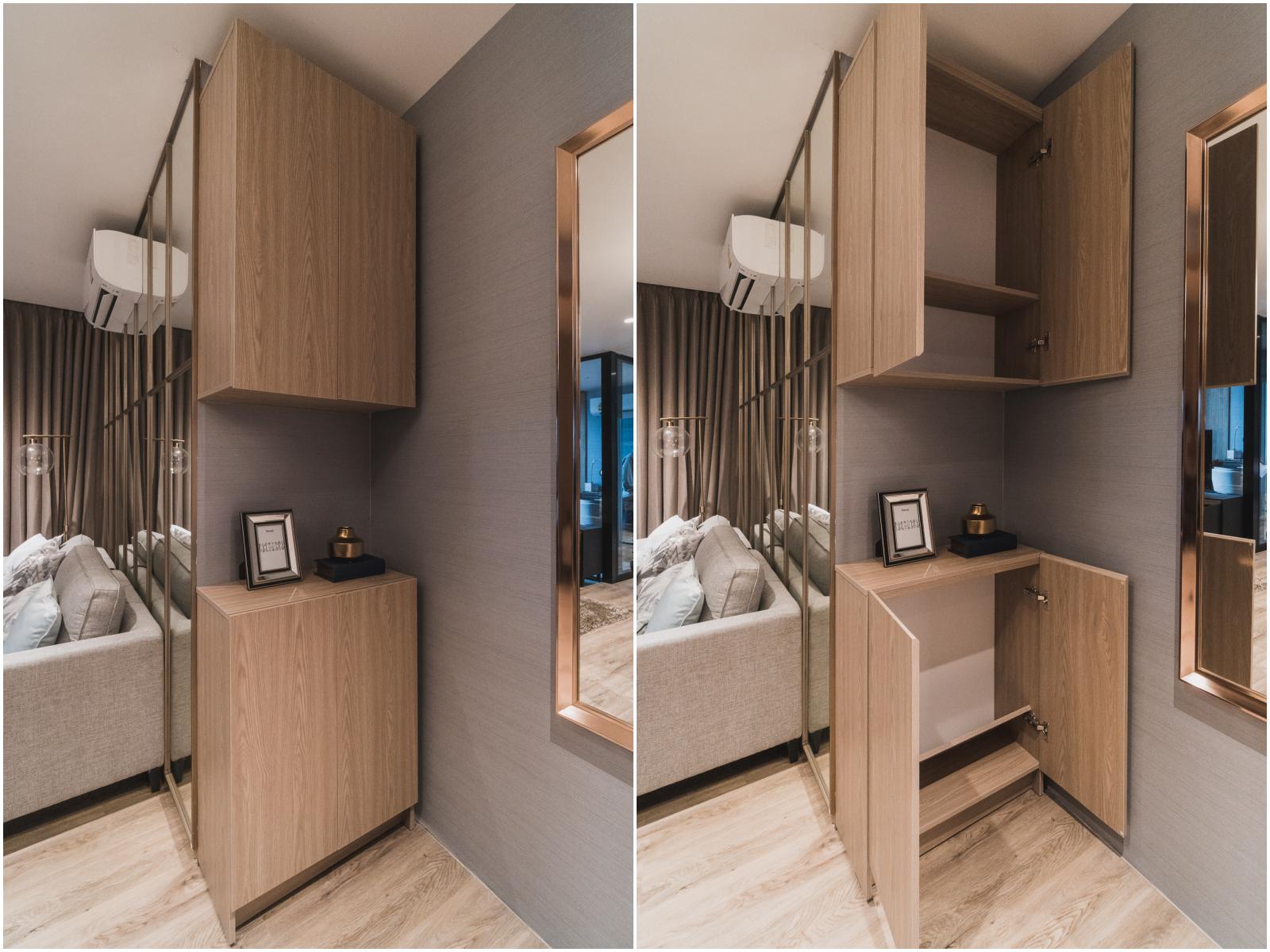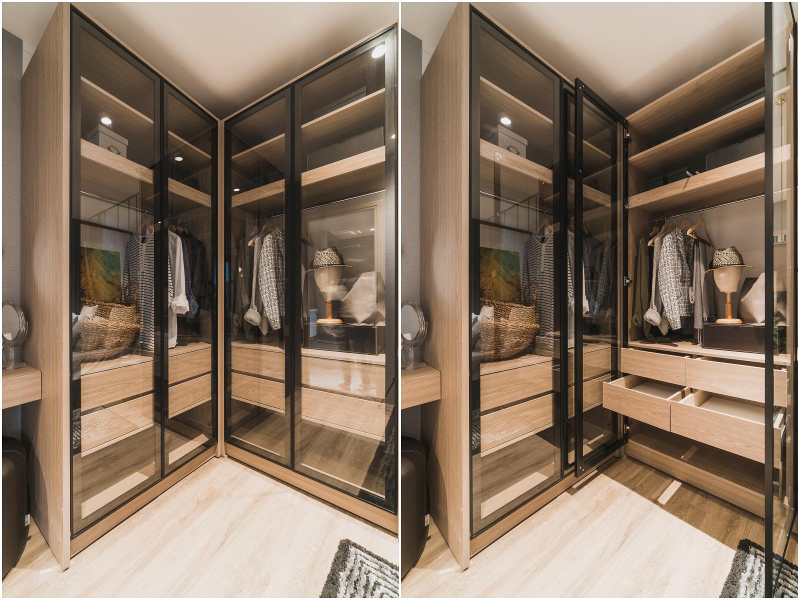ตู้เสื้อผ้าเป็นแบบเข้ามุม โดยหน้าตู้จะติดเป็นประตูกระจกใส บานเปิด-ปิดแบบ Pop-up เพื่อช่วยลดแรงกระแทกที่อาจเกิดขึ้นได้ด้านในแบ่งฟังก์ชันให้ตอบโจทย์ไลฟ์สไตล์คนรุ่นใหม่ ที่ชื่นชอบและดูแลใส่ใจในการแต่งตัวมากขึ้น ซึ่งตู้เสื้อที่ทางโครงการให้สามารถจุของได้พอดีกับผู้อยู่อาศัย 1-2 คน
