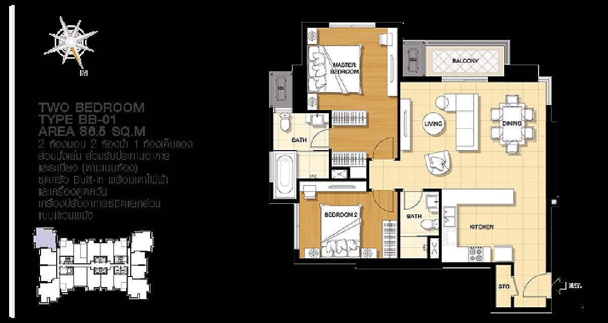 2 ห้องนอน 2 ห้องน้ำ 81.5 – 86.5 ตร.ม.