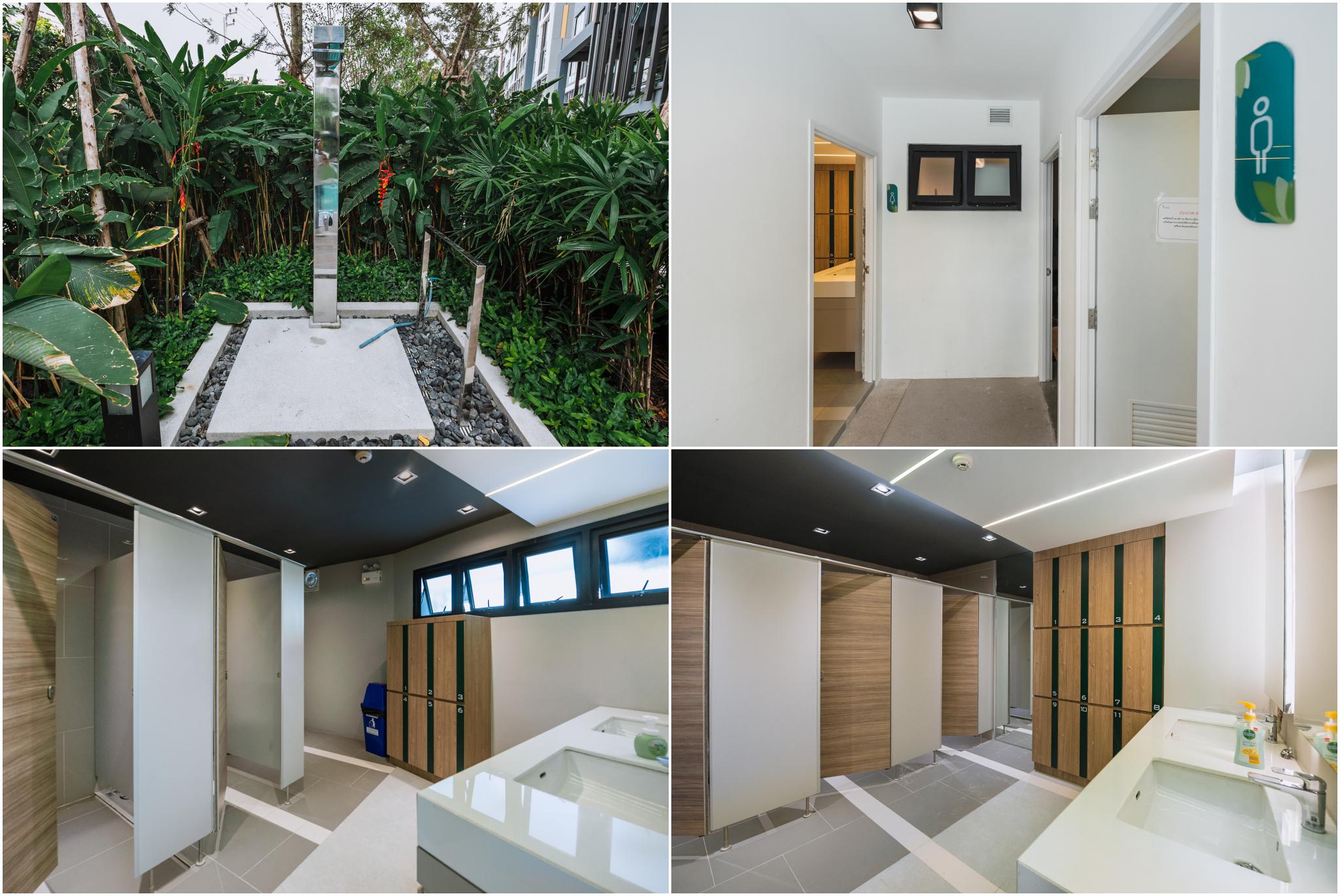 ห้องน้ำส่วนกลางจะแยกเป็นฝั่งชายหญิง มีล็อกเกอร์, ห้องอาบน้ำ และอ่างล้างหน้ารองรับการใช้งาน ส่วนฝักบัวล้างตัวสำหรับใช้ชำระล้างสิ่งสกปรกก่อนลงเล่นน้ำ จะให้บริการอยู่ที่ริมสระ