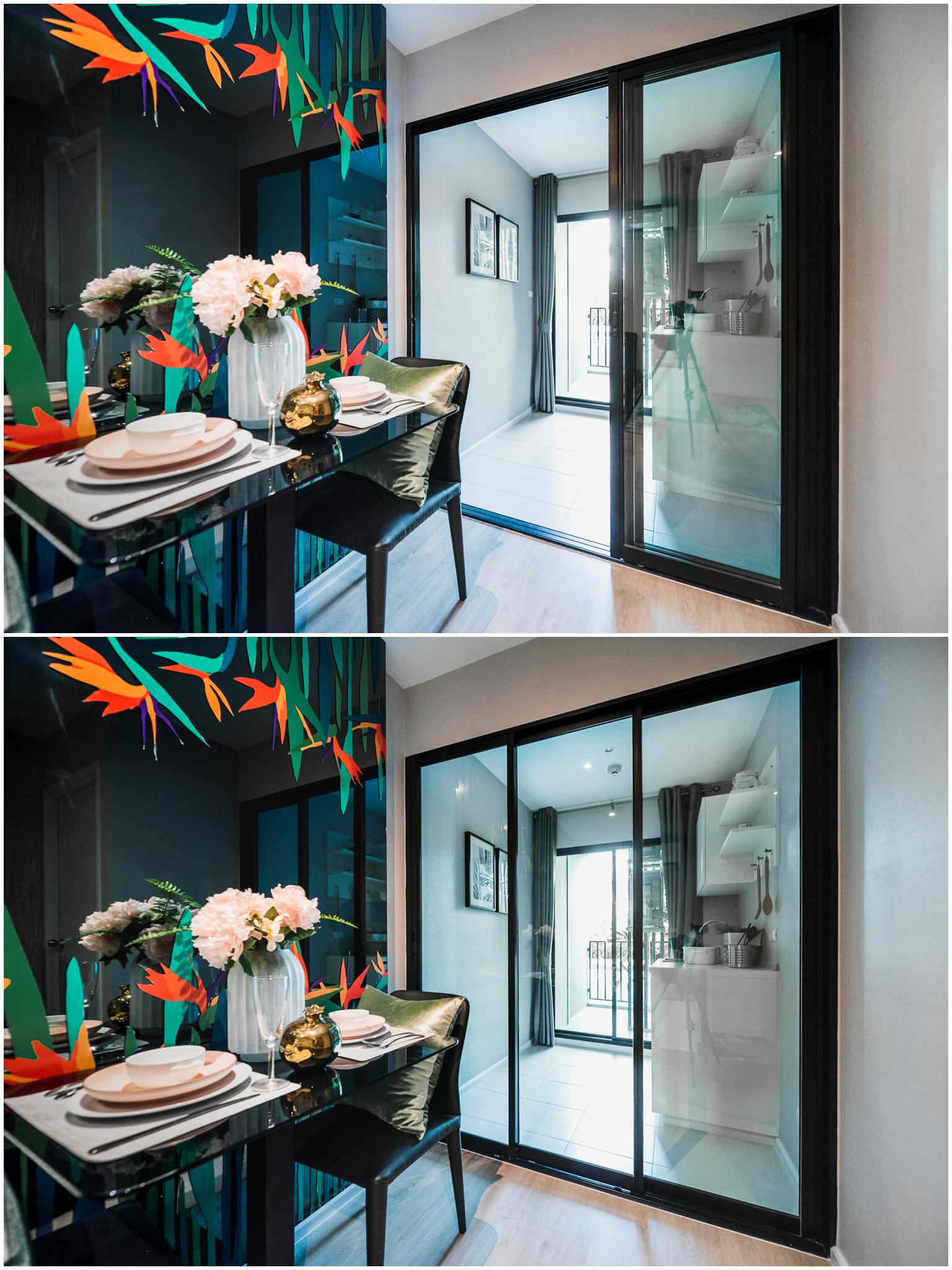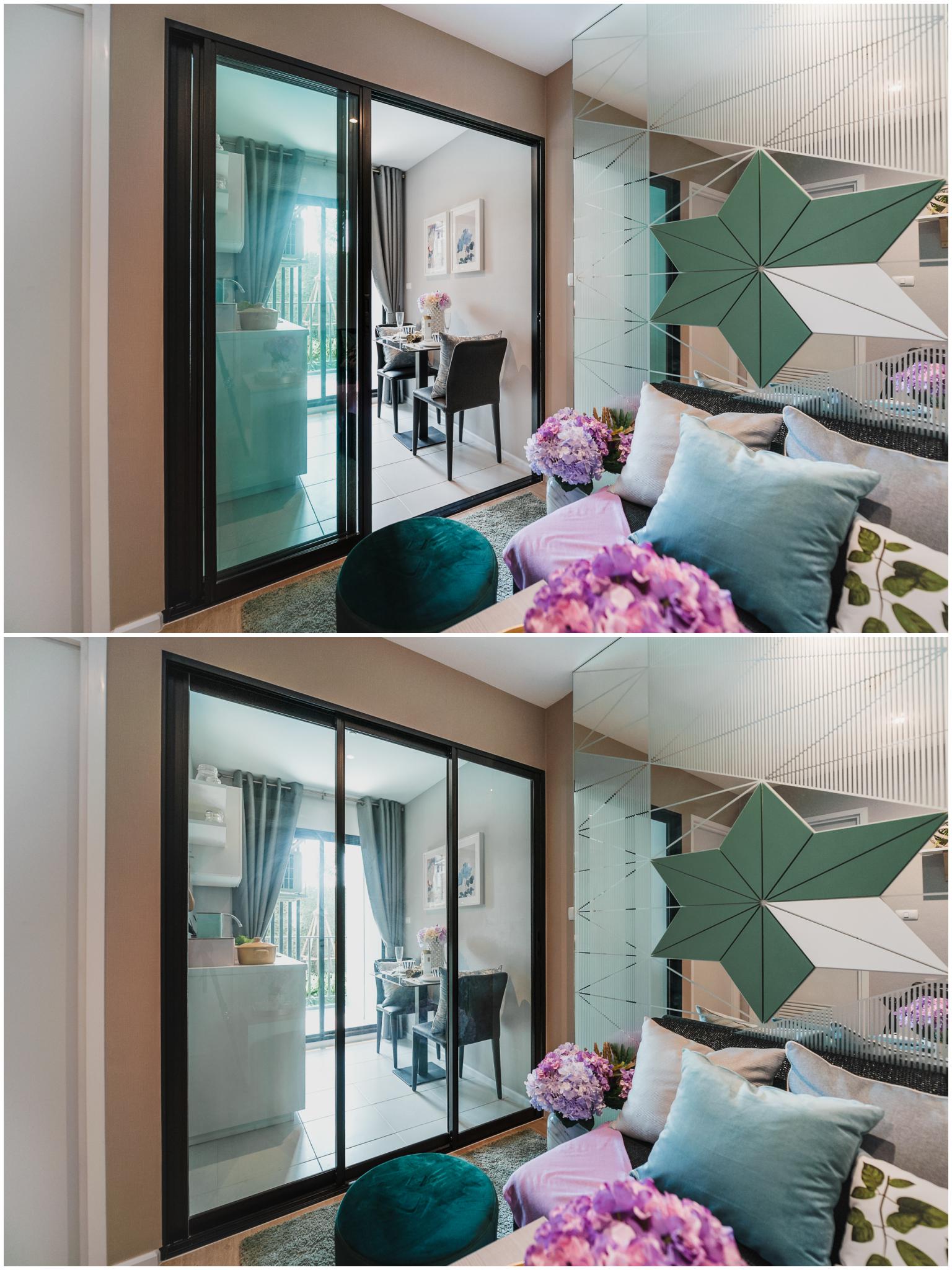 ทางด้านขวามือจากห้องนอนจะเป็นพื้นที่ครัวปิด ซึ่งอยู่ติดกับห้องนั่งเล่น ประตูบานเลื่อนกระจกแบบ 3 ตอน สามารถรับแสงแดดธรรมชาติจากด้านนอกให้เข้ามาที่ส่วนพื้นที่ห้องนั่งเล่นได้เต็มที่