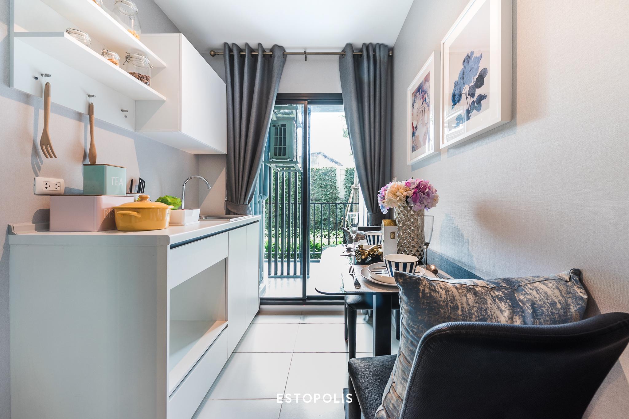 ส่วนครัวของห้องมีขนาดค่อนข้างพอเหมาะ ไม่คับแคบจนเกินไปนัก โดยทางโครงการได้มอบชุดโต๊ะทานข้าวขนาดเล็กพร้อมเก้าอี้นั่งมาให้ 2 ตัว และยังสามารถจัดวางไว้บนพื้นที่นี้ได้สบายๆ