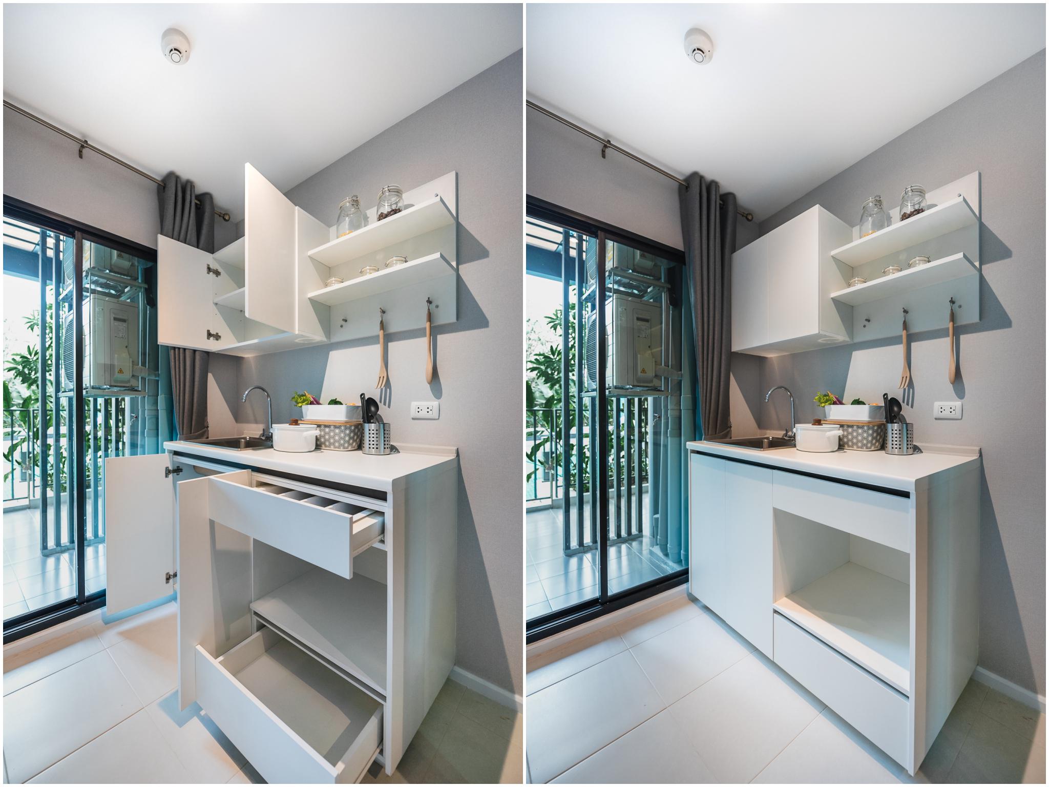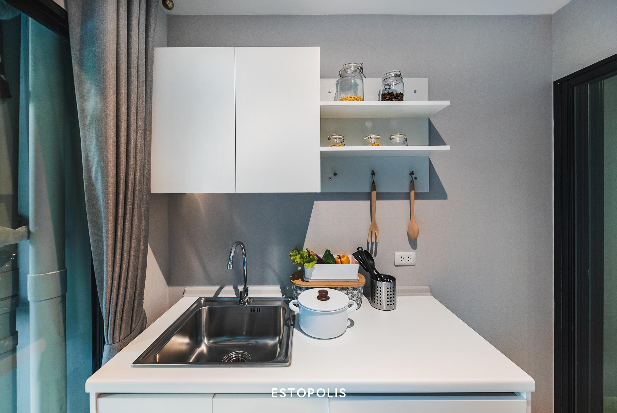 ทางโครงการบิลต์อินชุดครัวมาให้อย่างดี มีลิ้นชักและตู้จัดเก็บสิ่งของมาให้ครบ ทั้งส่วนของการจัดเก็บช้อนส้อม, อุปกรณ์เครื่องครัว, ที่จัดเก็บอาหารแห้ง, เครื่องปรุง และช่องสำหรับวางเตาไมโครเวฟพร้อมปลั๊กไฟที่ด้านหลัง ส่วนเครื่องใช้ในครัวที่ทางโครงการให้จะเป็นซิงก์ล้างจานแบรนด์ MEX แต่ถ้าใครอยากทำอาหารทานเองก็สามารถซื้อเตาไฟฟ้ามาวางเพิ่มเองได้ โดยข้อดีของการมีครัวอยู่ติดระเบียงแบบนี้ ก็คือ สามารถเปิดประตูเพื่อระบายกลิ่นอาหารออกสู่ด้านนอกอาคารได้ อีกทั้งลักษณะครัวแบบปิดที่กั้นแยกกับส่วนอื่นๆ ของห้อง ยังช่วยให้กลิ่นอาหารไม่ไปรบกวนส่วนอื่นๆ ของห้องด้วยเช่นกัน