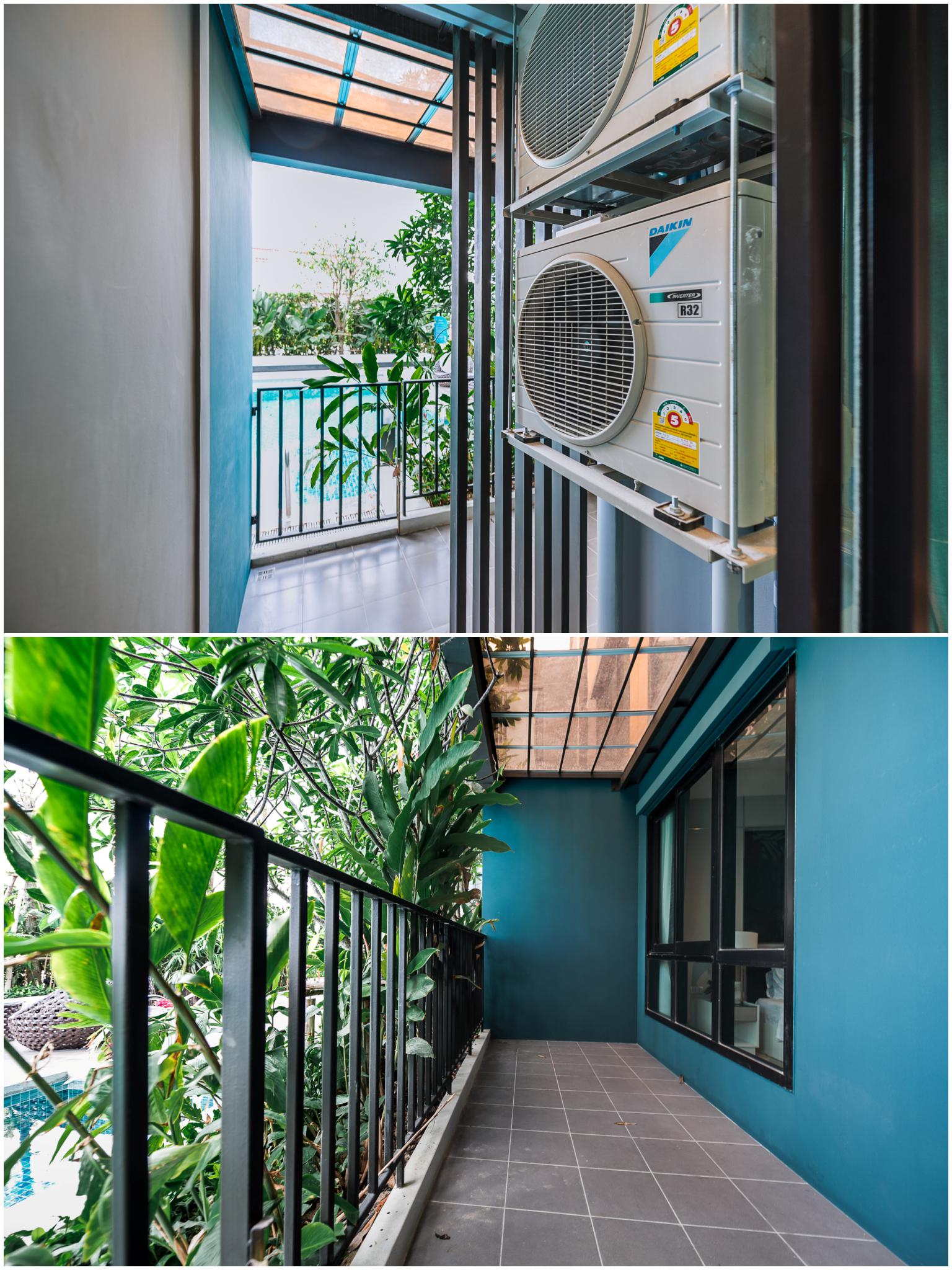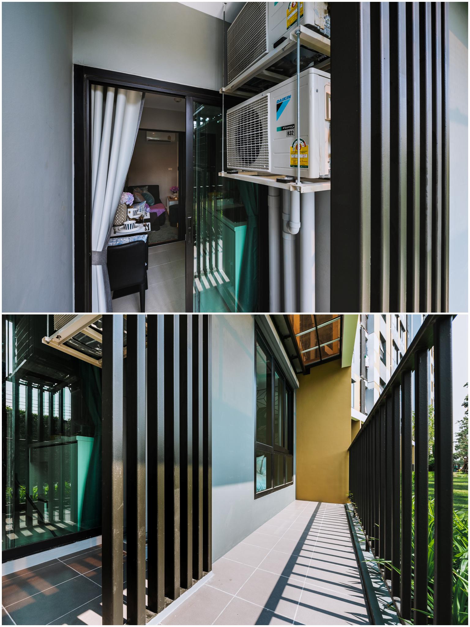 ถัดออกมาที่ส่วนระเบียง จะเห็นชั้นวางคอมเพรสเซอร์แอร์ 2 ตัวอยู่ติดกับประตูบานเลื่อน ด้านล่างมีก๊อกน้ำสำหรับใช้ล้างทำความสะอาด ถัดไปเป็นพื้นที่ระเบียงขนาดใหญ่ ยาวเชื่อมต่อตั้งแต่ส่วนครัวไปจนถึงห้องนอน สามารถใช้วางราวตากผ้า และจัดเป็นมุมพักผ่อนชมวิวสระว่ายน้ำได้