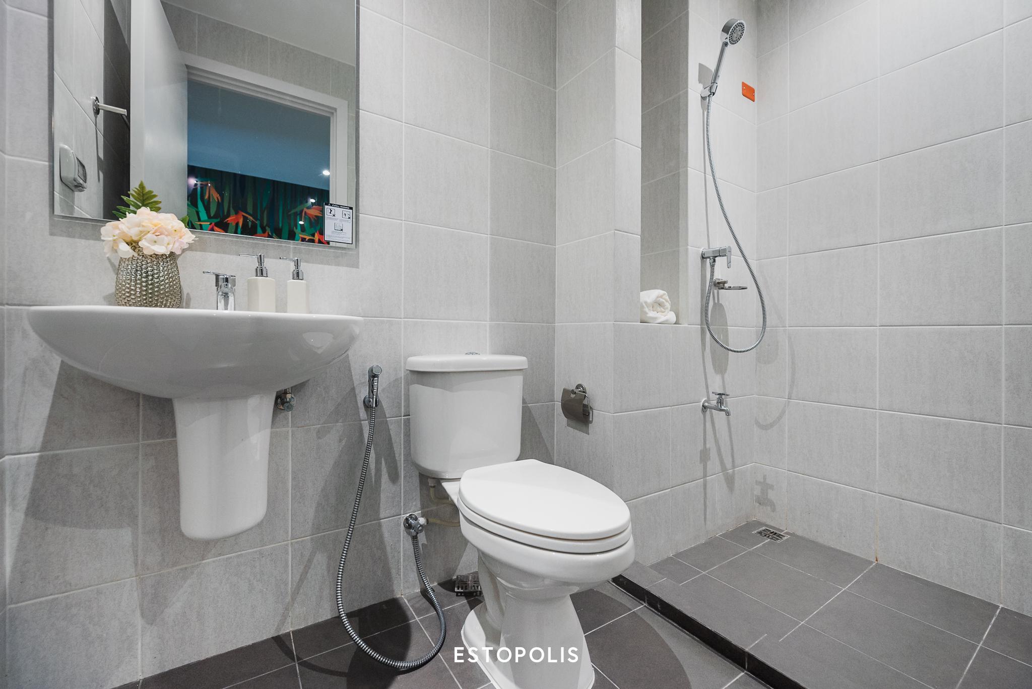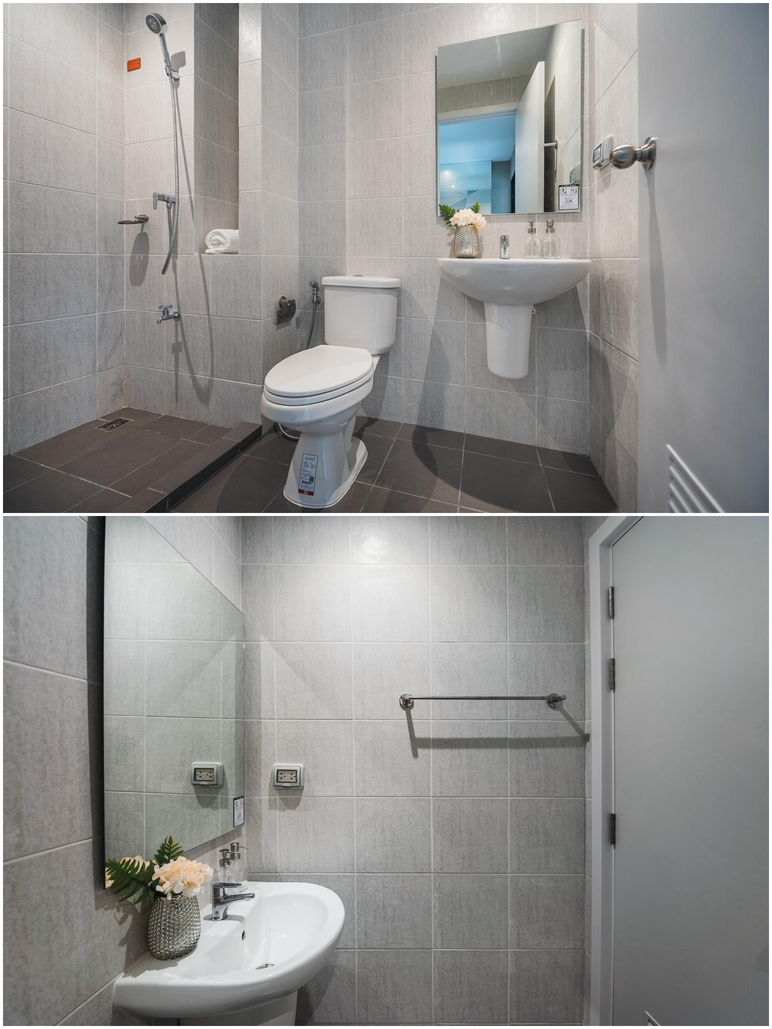 กลับเข้ามาภายในห้อง แล้วสำรวจพื้นที่ส่วนตัวสำคัญอย่างห้องน้ำกันต่อ เมื่อเปิดประตูเข้าไปเราจะเจอกับอ่างล้างหน้าก่อนเป็นอันดับแรก ทางด้านขวามือมีปลั๊กไฟพร้อมกล่องปิดกันน้ำเข้า สำหรับใช้เสียบไดร์เป่าผมและอุปกรณ์ไฟฟ้าอื่นๆ ติดกันเป็นราวสำหรับแขวนผ้า ถัดจากอ่างล้างหน้าจะเป็นโถสุขภัณฑ์ และฝักบัวตามลำดับ โดยอ่างล้างหน้าและโถสุขภัณฑ์จะเป็นของแบรนด์ COTTO ส่วนของอุปกรณ์สเตนเลสอย่างฝักบัว, ที่วางสบู่, สายชำระ, ที่ใส่กระดาษทิชชู่, ก็อกน้ำ และราวแขวนผ้าเป็นของแบรนด์ Prema พร้อมแยกโซนเปียกด้วยพื้นยกระดับ ป้องกันไม่ให้น้ำล้นออกมายังโซนแห้ง แต่ถ้าใครไม่อยากให้ละอองน้ำกระเด็นโดนส่วนแห้งมากนัก ก็อาจติดม่านเพิ่มเติมได้ในส่วนนี้