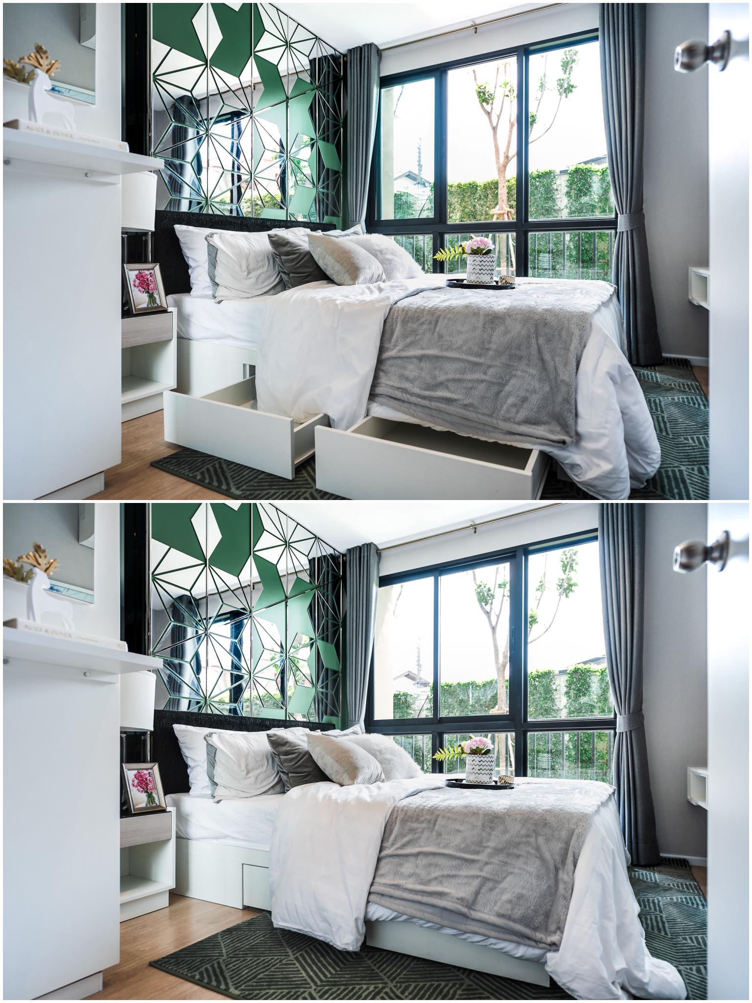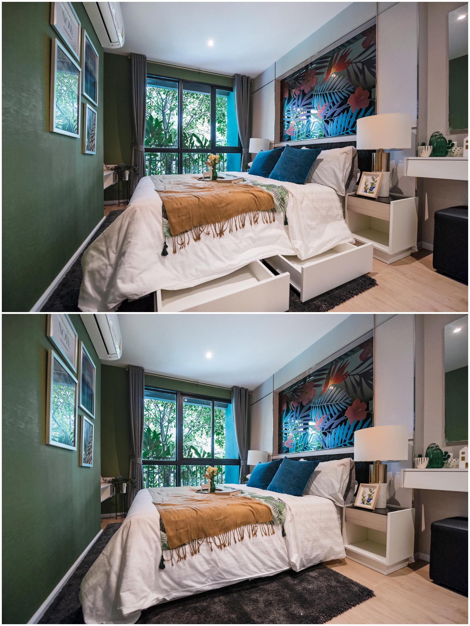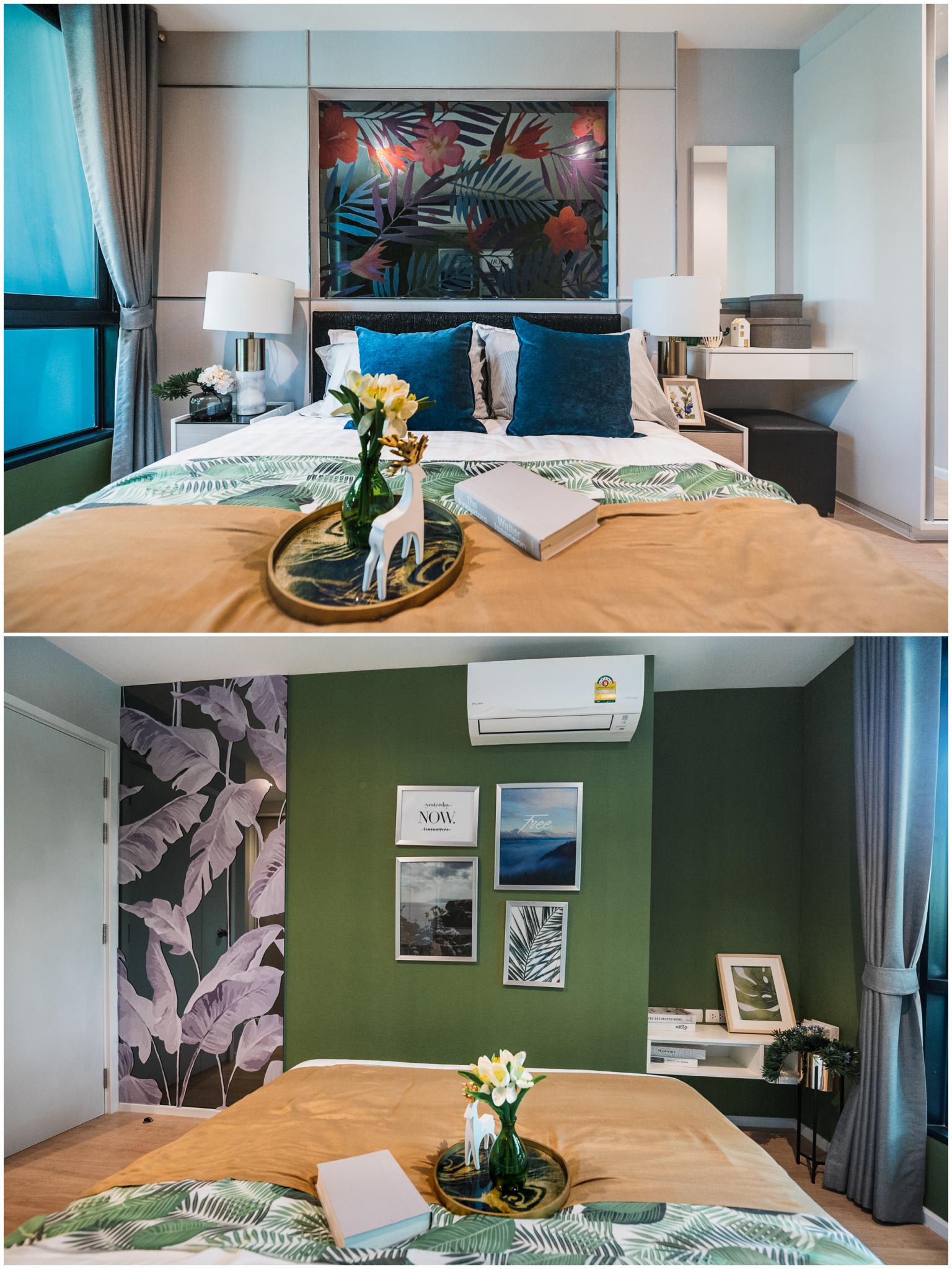ห้องนอนของห้องขนาด 28 ตารางเมตรจะอยู่ติดกับห้องน้ำ สะดวกในการเข้าใช้งาน และภายในห้องนอนยังเชื่อมต่อกับบริเวณระเบียงด้วยกระจกใสเต็มความสูงห้อง ทำให้แสงสามารถส่องเข้าถึงห้องได้เต็มๆ ข้อดีคือ ช่วยให้ห้องดูกว้างและโล่งสบาย โดยบริเวณกระจกสามารถเลื่อนเปิดเพื่อระบายอากาศ หรือรับลมจากด้านนอกอาคารได้อีกด้วย ทั้งยังสามารถสัมผัสธรรมชาติสีเขียวจากวิวด้านนอกได้ตลอด 24 ชั่วโมง