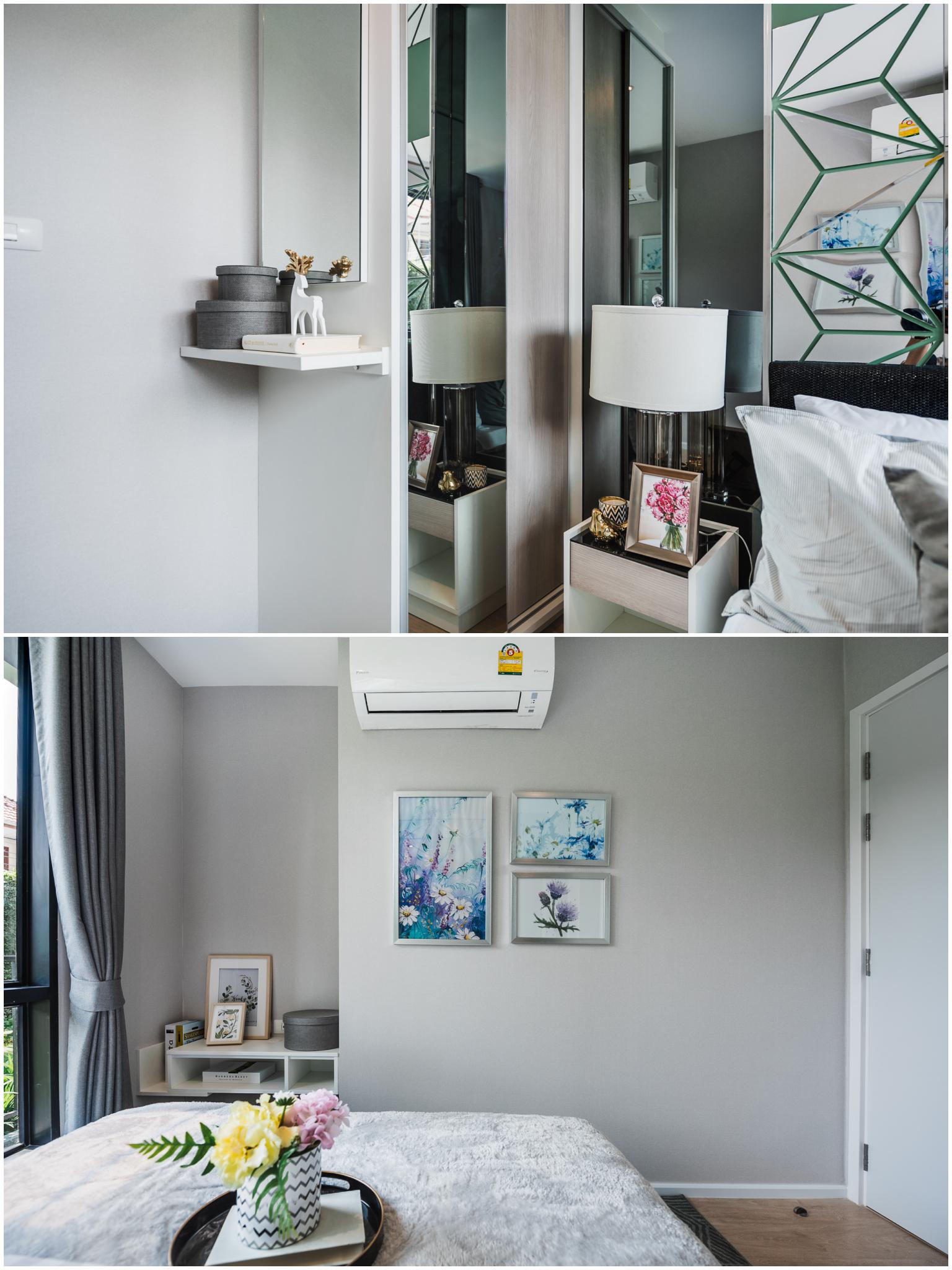 สำหรับโต๊ะหัวเตียงของห้องขนาด 37 ตารางเมตร ทางโครงการได้ให้มาถึง 2 ตัว สามารถวางได้ทั้งโคมไฟ, จัดเก็บหนังสือ หรือวางอุปกรณ์อิเล็กทรอนิกส์ต่างๆ ได้ใกล้มือ ส่วนปลายเตียงบิลต์อินเป็นชั้นลอยอเนกประสงค์ พร้อมช่องสำหรับจัดเก็บสายไฟ จะใช้วางทีวี หรือจัดเป็นมุมสำหรับนั่งทำงานขนาดเล็กก็สามารถทำได้ตามใจ