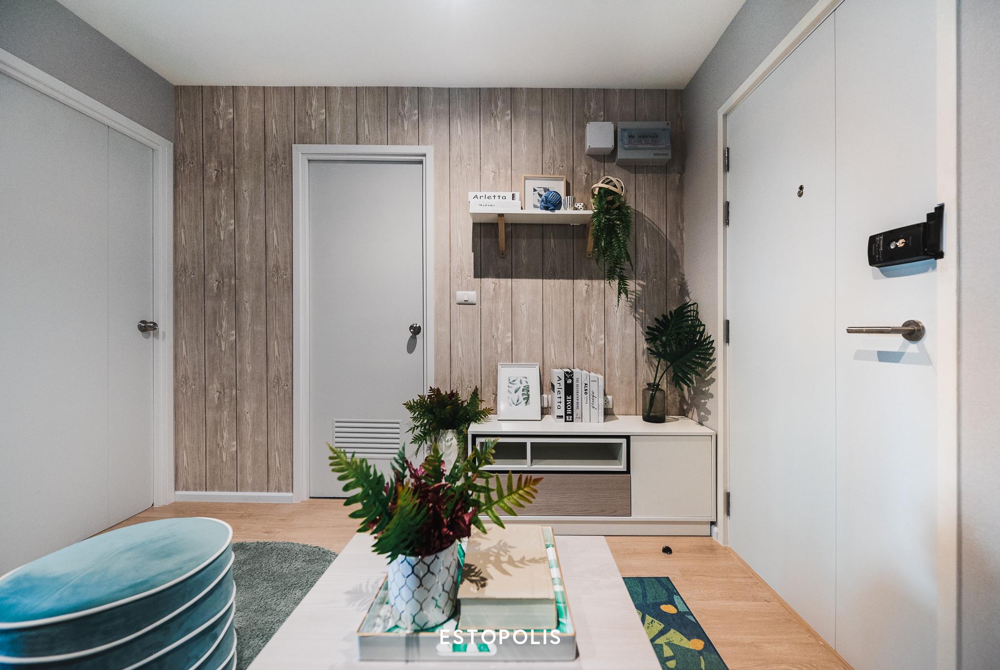 เมื่อเข้ามาภายในห้อง จะเจอกับพื้นที่ห้องนั่งเล่นก่อนเป็นอันดับแรก โดยทางโครงจะมอบเฟอร์นิเจอร์อย่าง ชั้นวางทีวีพร้อมโต๊ะกลาง และโซฟาให้