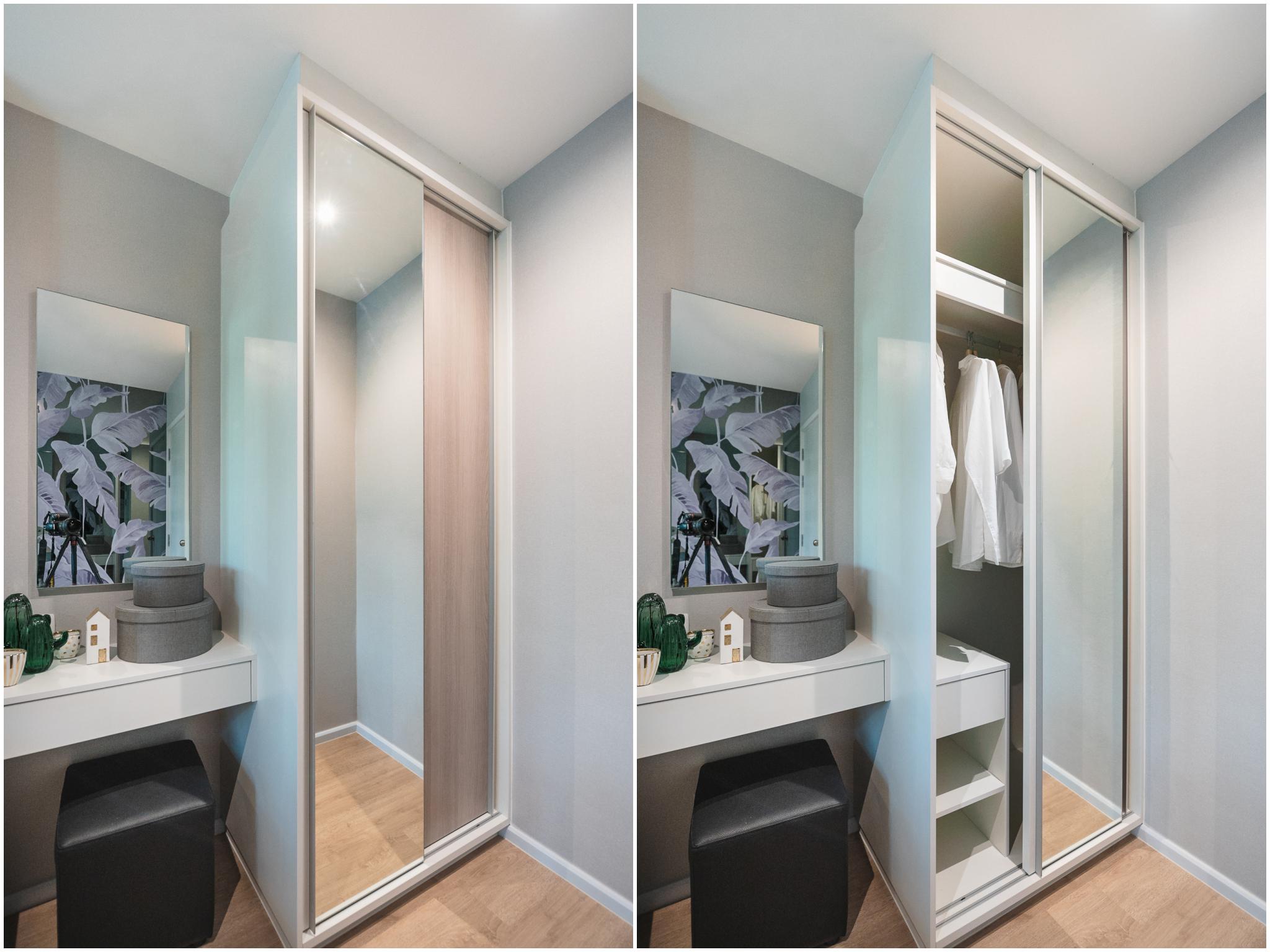 ถัดจากเตียงมาจะเป็นโต๊ะเครื่องแป้ง พร้อมเก้าอี้นั่งและตู้เสื้อผ้าบิลต์อินตามลำดับ โดยทางโครงการได้บิลต์ตู้เสื้อผ้าแบบเต็มความสูงห้องมาให้ จึงมีพื้นที่จัดเก็บเสื้อผ้าได้อย่างเพียงพอ พร้อมติดกระจกบานใหญ่ไว้หน้าตู้ ให้ตรวจเช็กความเรียบร้อยทุกครั้งก่อนออกจากห้องอีกด้วย