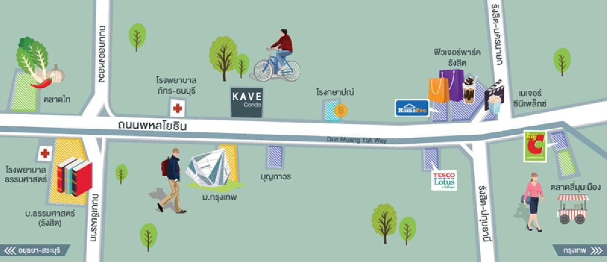 โครงการ Kave Condo (เคฟ คอนโด) ตั้งอยู่ในทำเลที่สะดวกต่อการเดินทางสำหรับคนที่อาศัยอยู่ในย่านรังสิตอยู่แล้ว ยิ่งคนที่ต้องเข้ามาทำงานในกรุงเทพ ก็ยิ่งสะดวกเพราะออกจากโครงการมาก้ไม่ต้องกลับรถเลย อีกอย่างถ้าคนที่ต้องการซื้อเพื่อปล่อยเช่านักศึกษา โครงการก็อยู่ในทำเลที่สะดวกกับน้องๆมาก เพราะแค่ข้ามสะพานลอยหน้าโครงการก็ถึงมหาวิทยาลัยแล้ว อีกอย่างคือทำเลในย่านนั้นยังมีความเป็นชานเมืองอยู่ ทำให้ไม่มีเรื่องสิ่งรบกวนมากมายนัก