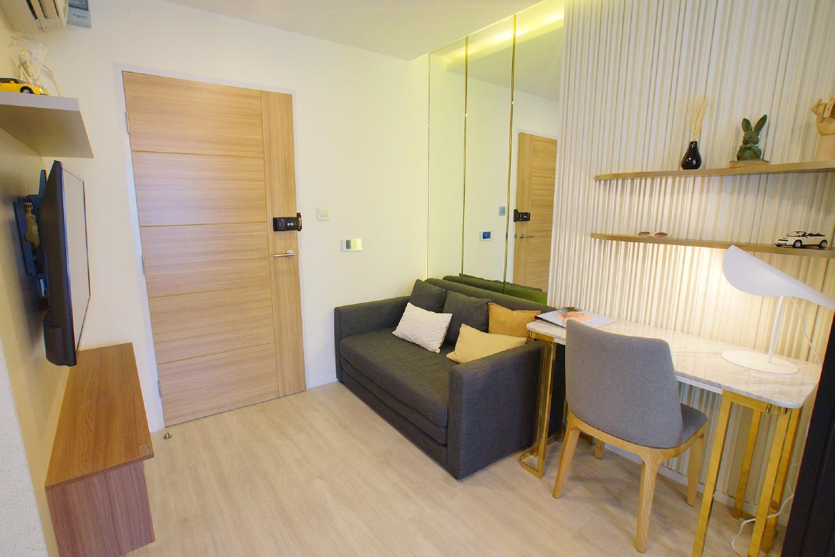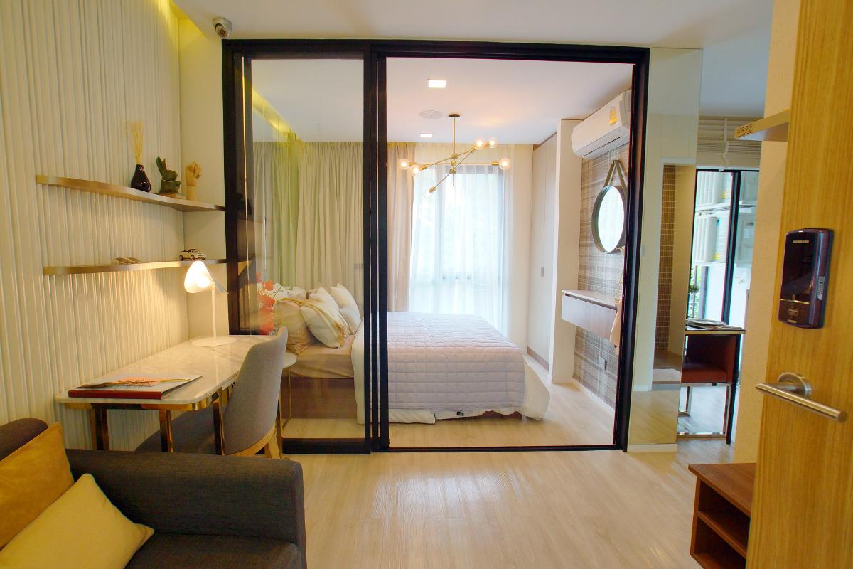เริ่มแรกตั้งแต่เปิดประตูเข้าห้องมาเลย จะเจอกับส่วนของ Living Area และเห็นห้องนอนที่กั้นด้วยบานกระจกสไลด์ ความสูงในห้องจากพื้นถึงฝ้า 2.4 เมตร พื้นห้องใช้วัสดุ smart vinyl