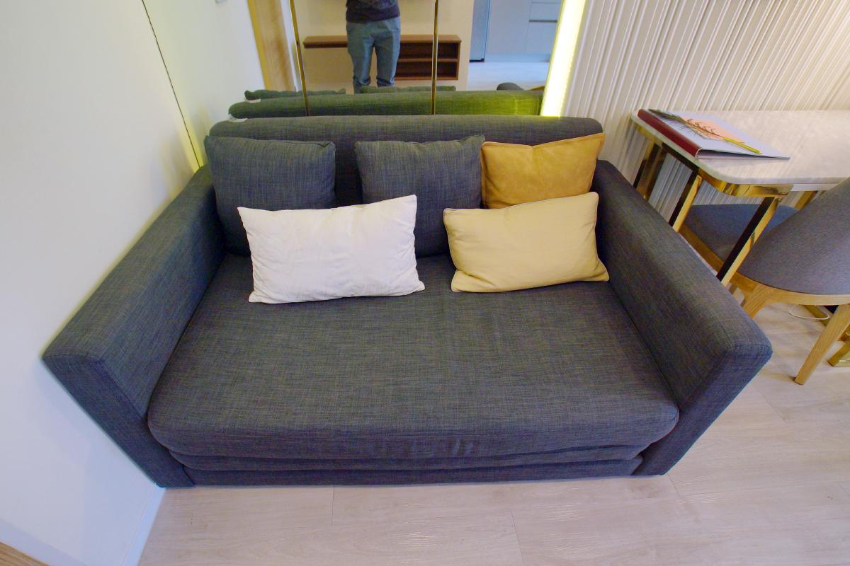 ด้านหลังประตูห้องจะเป็นโซฟาขนาด 2 ที่นั่ง แบบสามารถกางออกมาเป็นที่นอนได้ เผื่อวันไหนมีเพื่อนๆมาเยี่ยม