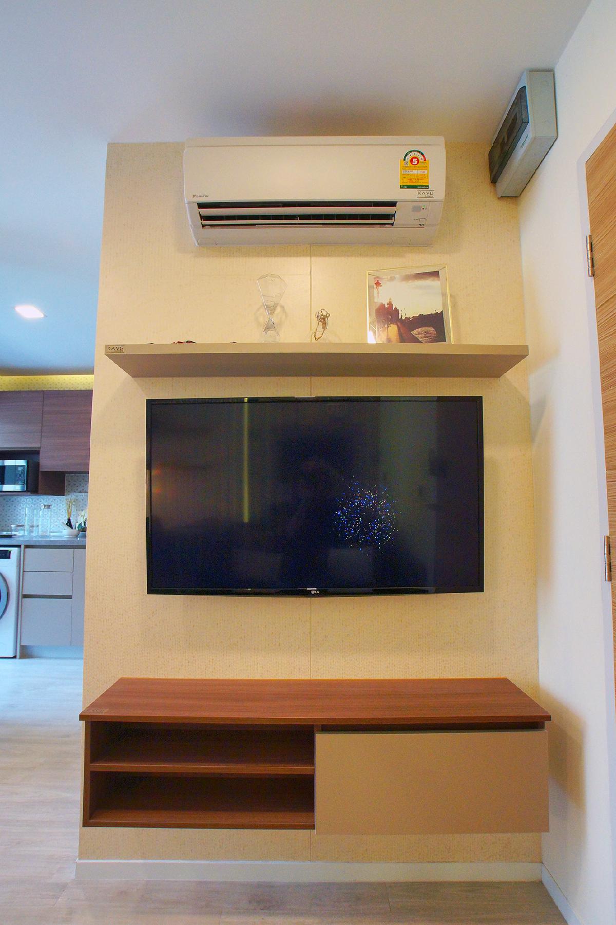ส่วนฝั่งตรงข้ามจะเป็นชั้นวางทีวี แต่ห้องตัวอย่างติดทีวีแบบแขวนผนังมา ด้านบนมาชั้นวางของ จุดติดตั้งแอร์และกล่อง Service
