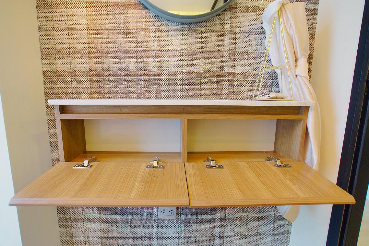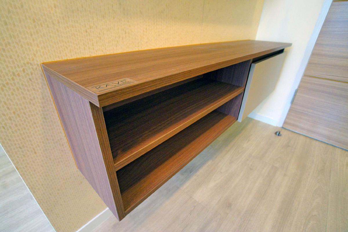 ตัวไซด์บอร์ที่ให้มาจะเป็นแบบชั้นเปิด และลิ้นชัก เก็บของได้อย่างละครึ่ง สำหรับเฟอร์นิเจอร์ที่ทางโครงการแถมมาให้จะมีสติกเกอร์ KAVE แปะไว้แบบนี้