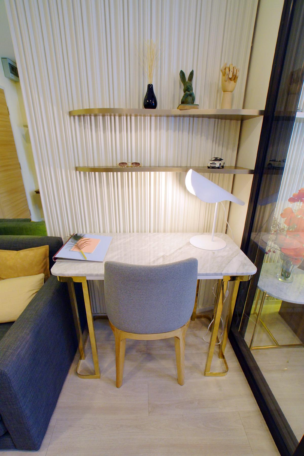 โต๊ะทำงานที่โครงการวางมาให้พอดีกับช่องว่างที่เหลือด้านข้างโซฟา ใครไม่ค่อยชอบทำการบ้านจะทำเป็นโต๊ะทานข้าวก็ได้อยู่ เผื่ออยากกินข้าวไปดูทีวีไป