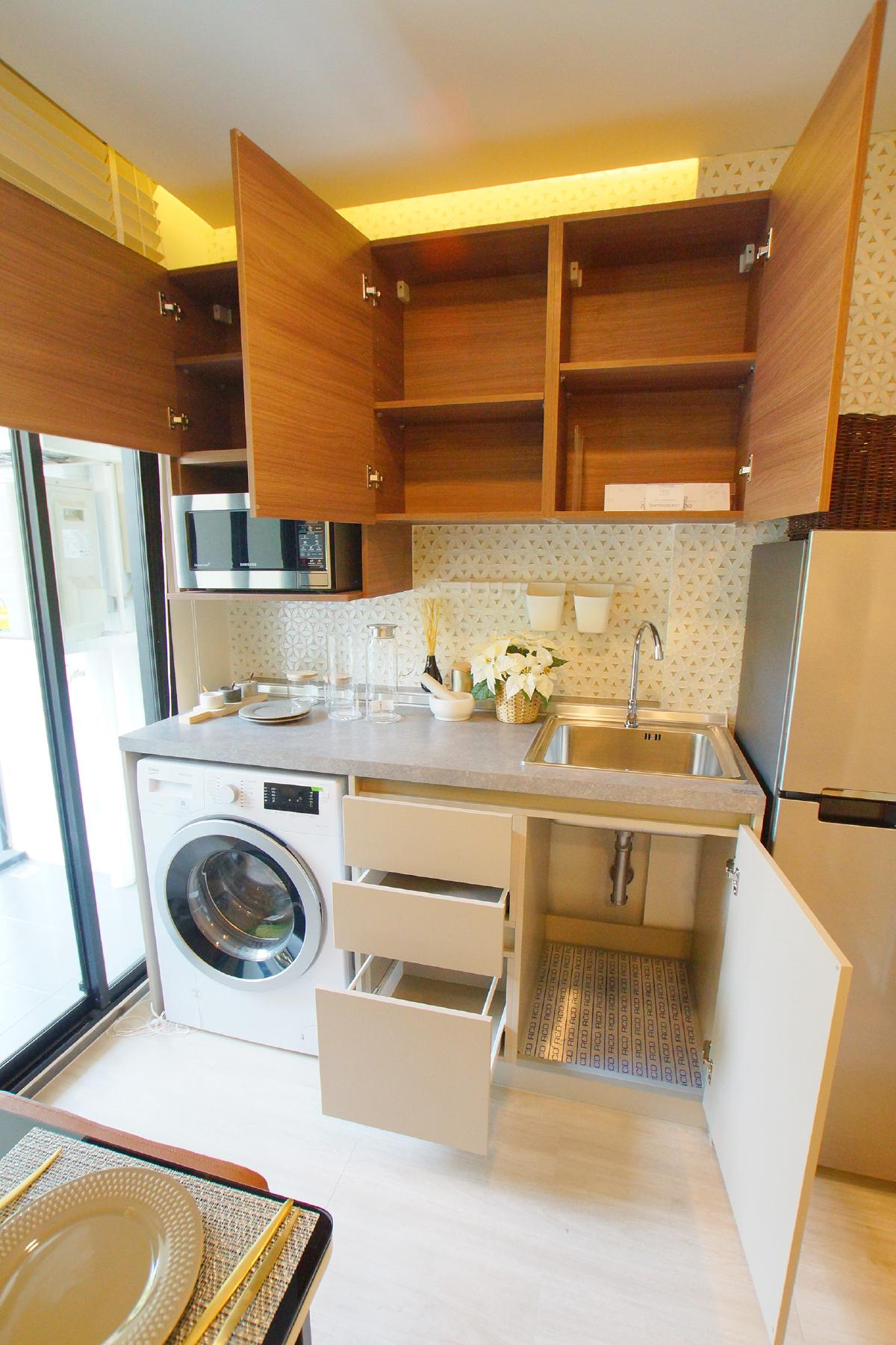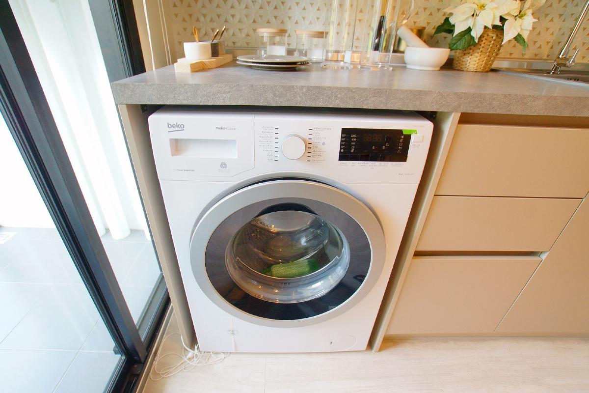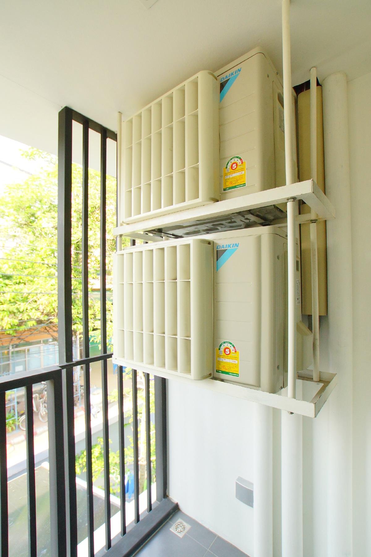 ที่ระเบียงมีจุดติดตั้ง CDU แอร์แบบแขวนได้ 2 ตัวซ้อนกัน ส่วนด้านล่างจริงก็สามารถวางเครื่องซักผ้าได้ แต่ก็มีจุดวางแล้วในครัว โครงการทำปลั๊กไฟมาให้ 1 จุด