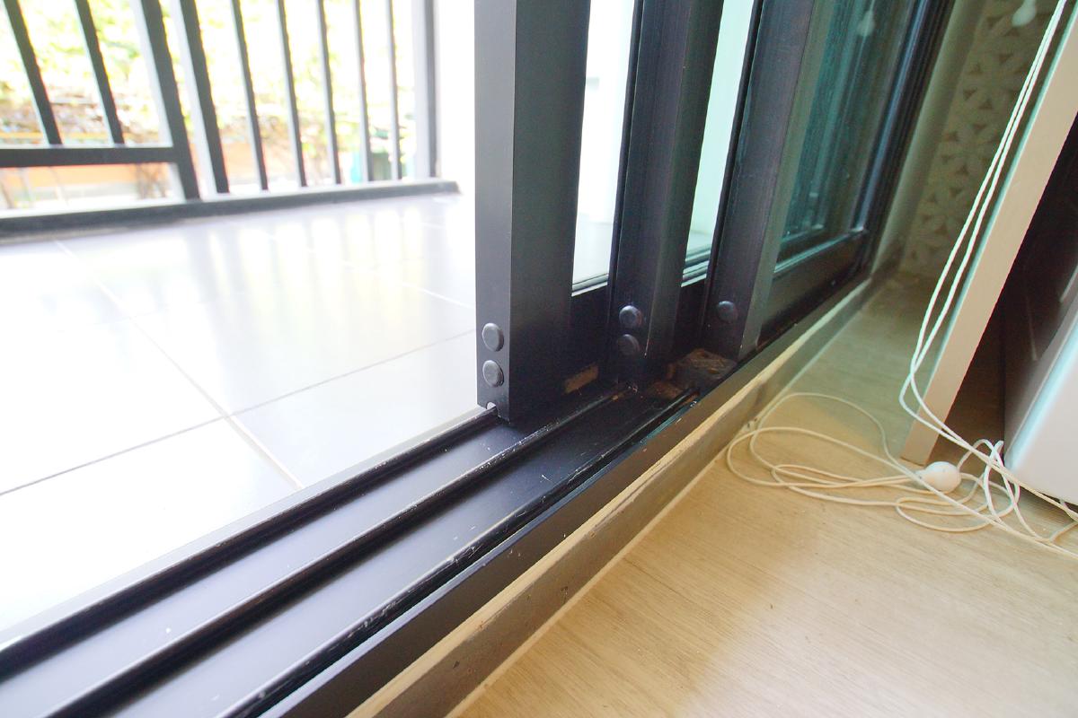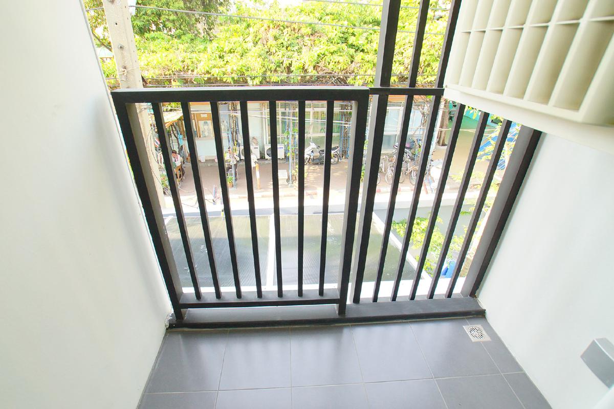 พื้นระเบียงด้านนอกเป็นกระเบื้องขนาด 30x30 ซม. สีเทา ราวระเบียงเป็นเระแนงเหล็กสีดำ พื้นที่ใช้สอยระเบียงประมาณ 160x80 ซม.
