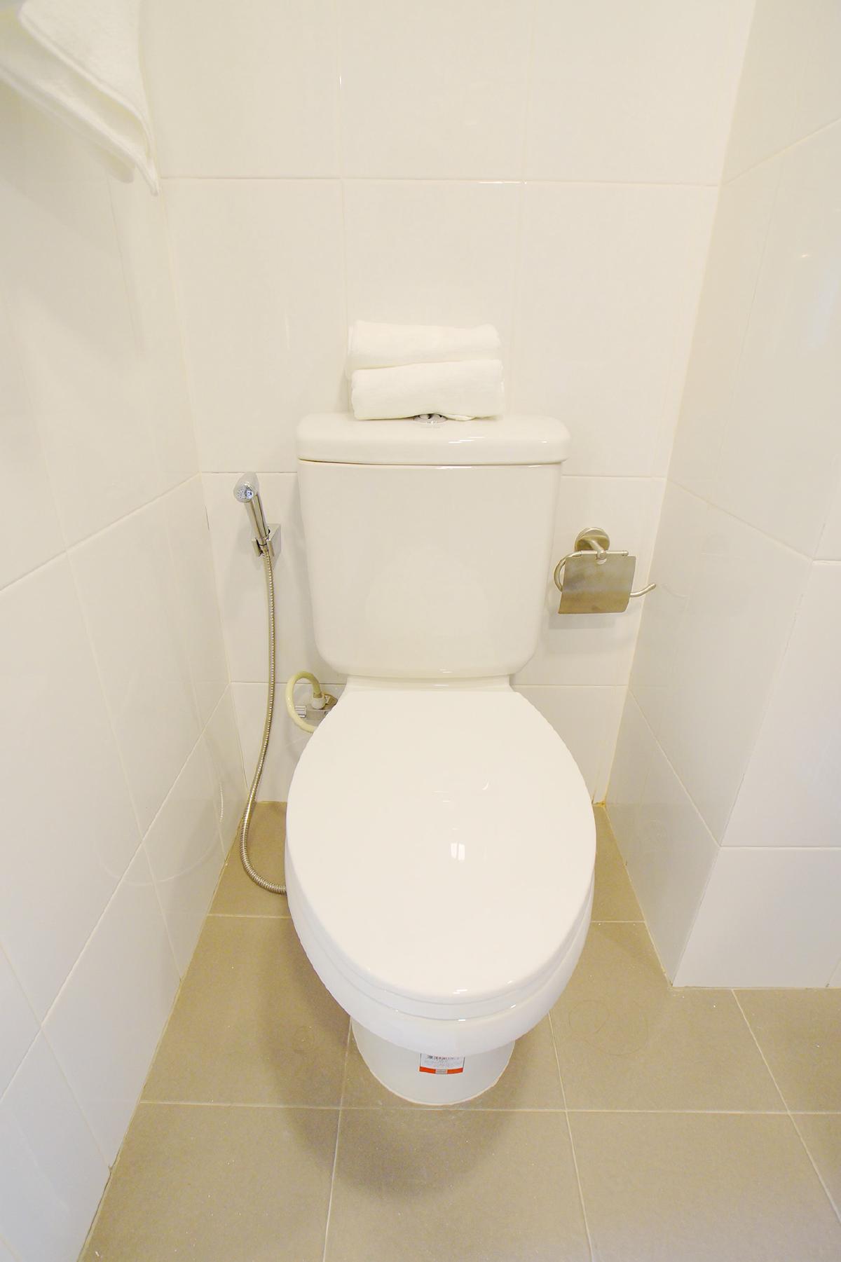 ติดกับประตูทางซ้ายมือจะเป็นโถสุขภัณฑ์ของ Cotto มีสายชำระและที่ใส่ทิชชูติดมาด้านข้าง