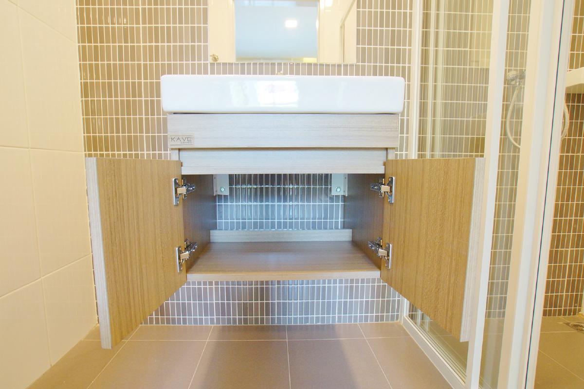 ใต้อ่างล้างหน้าเปิดออกมาได้ช่องเก็บของแบบนี้ค่ะ ผนังด้านหลังจะกรุกระเบื้องโมเสกสีน้ำตาล