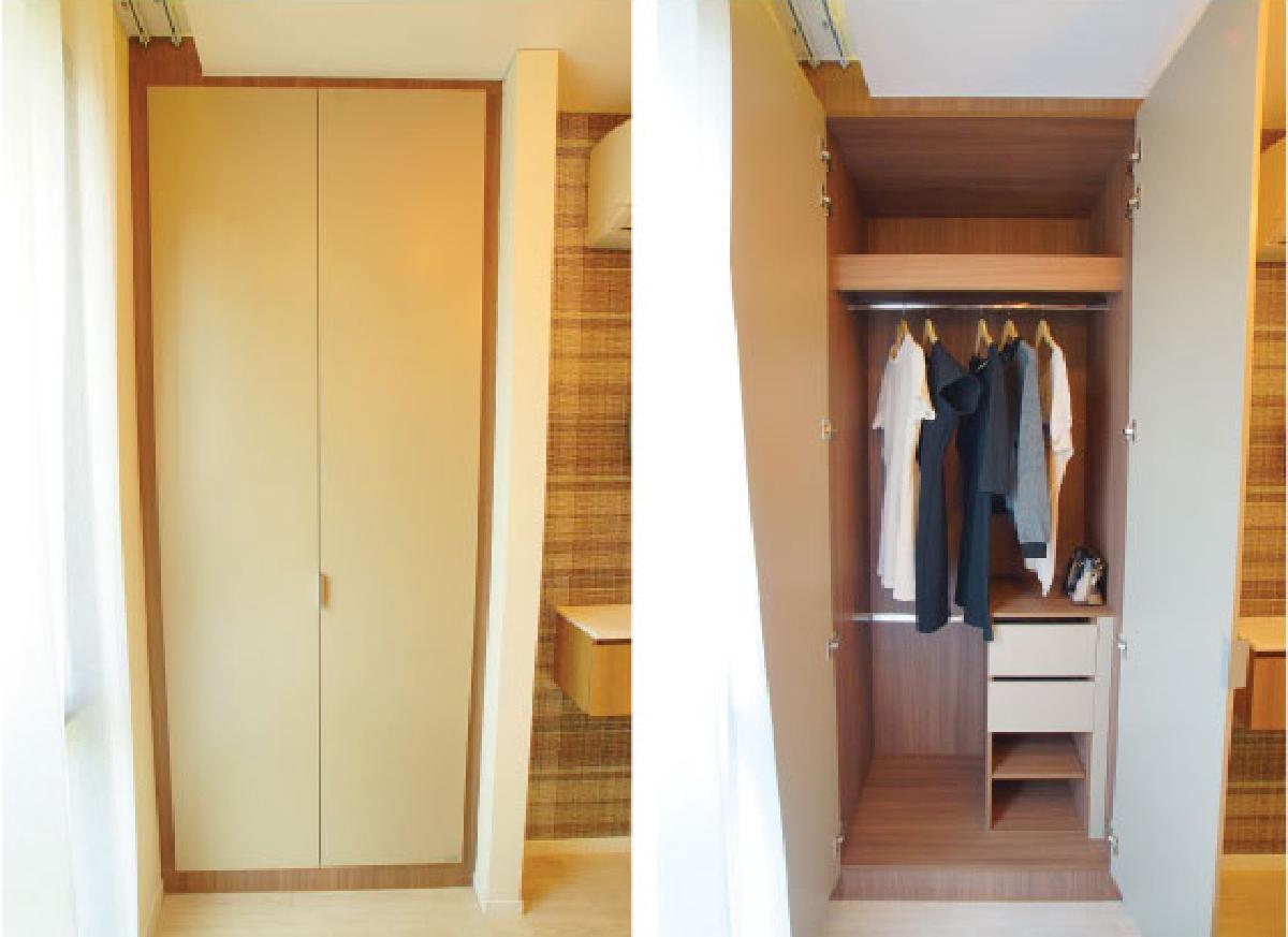 ปลายเตียงข้างๆโต๊ะเครื่องแป้งก็เป็นตู้เสื้อผ้า โครงการบิวท์มาให้สูงถึงฝ้า ทำให้ได้ช่องเก็บของด้านบนเพิ่มอีก ไม่ต้องกังวลเรื่องฝุ่นเหมือนเวลาวางของเก็บไว้หลังตู้เสื้อผ้า