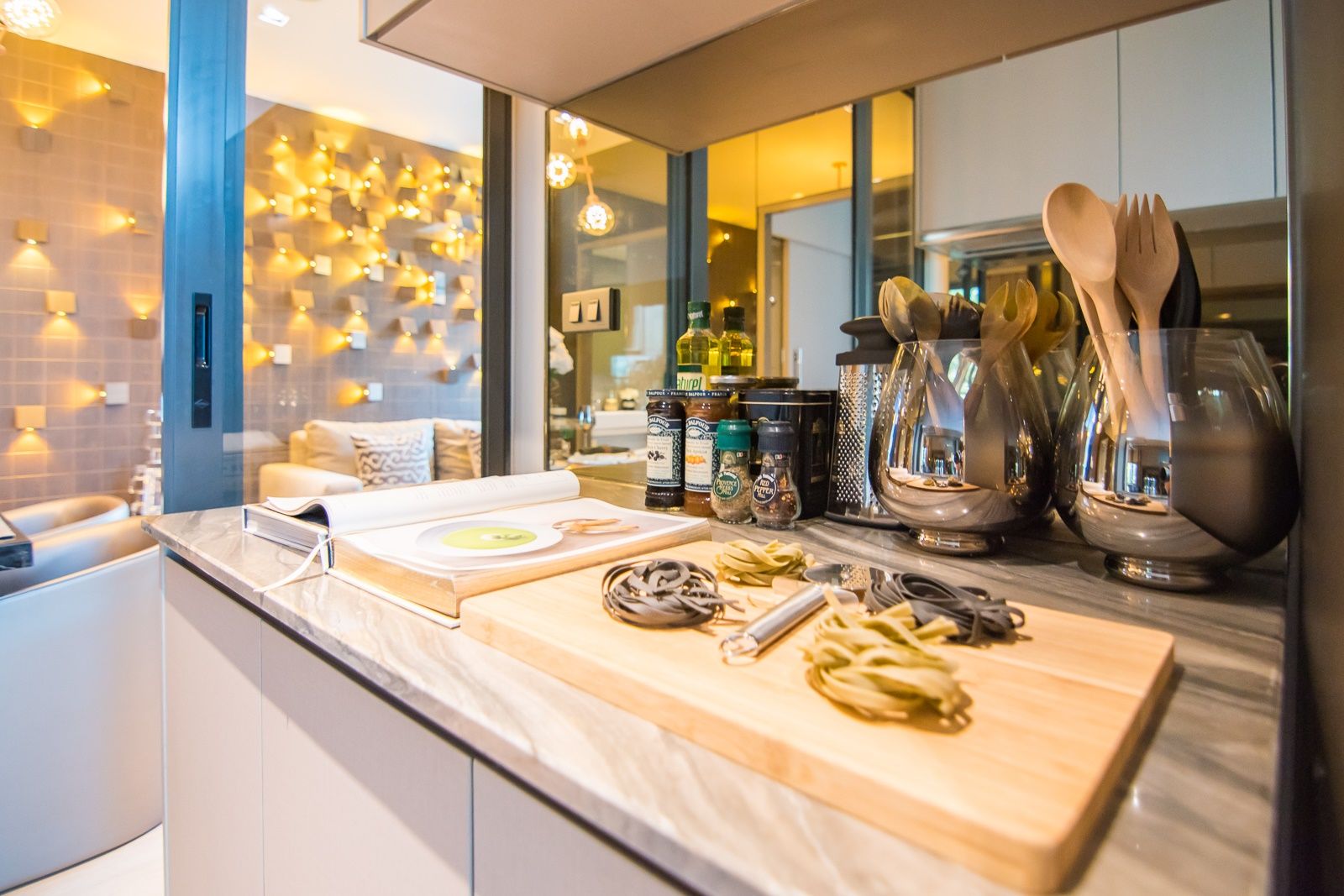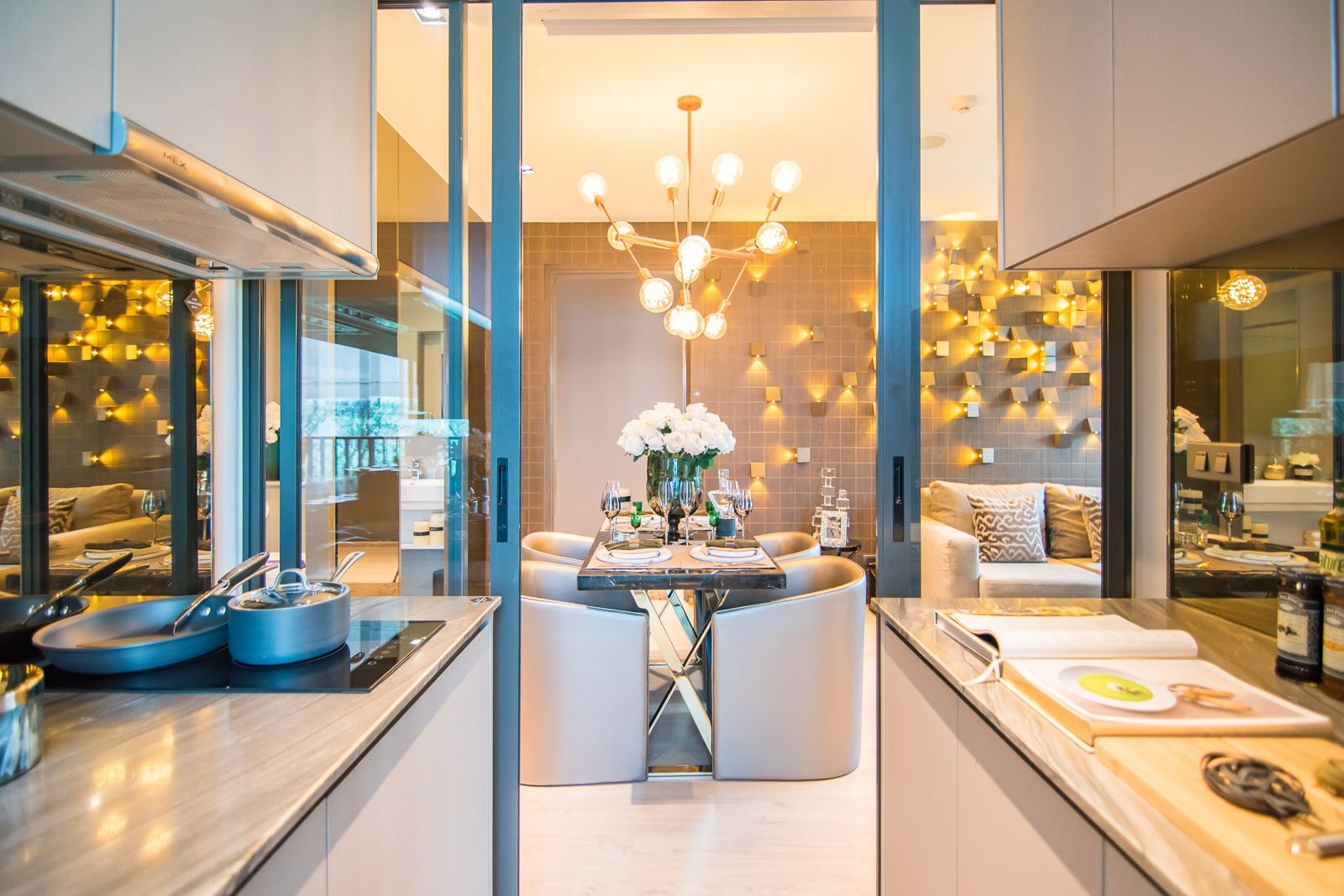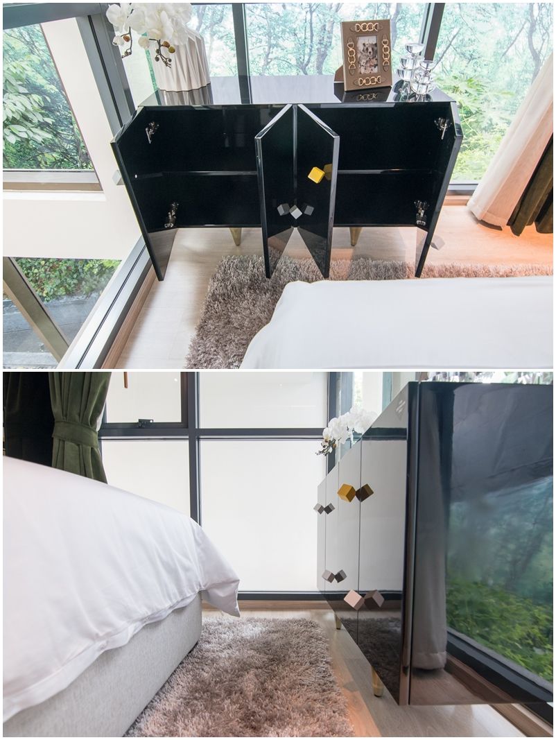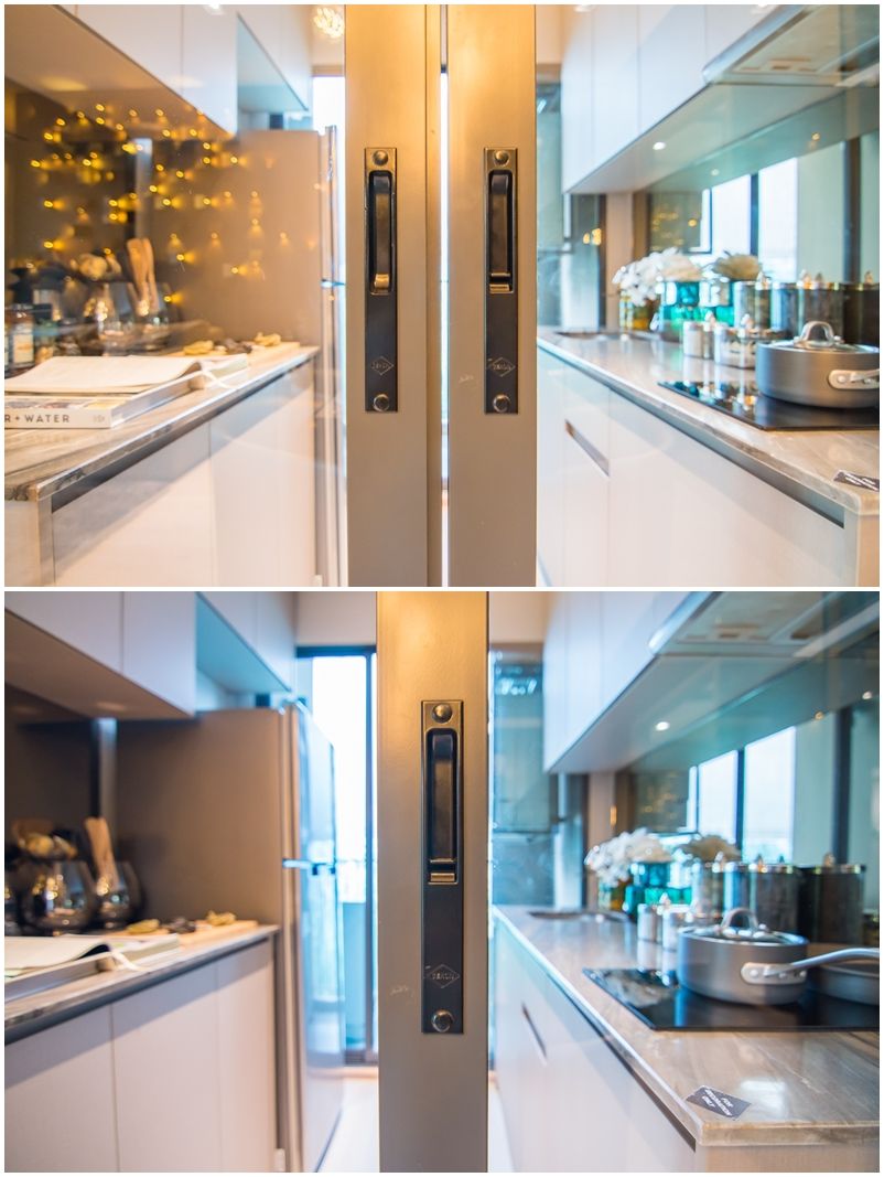 ห้องครัวกลายเป็นโซนแรกของห้อง มาพร้อมโต๊ะทานข้าวแบบ built in ใช้แบ่งพื้นที่ครัวกับห้องนั่งเล่นออกจากกัน และทางด้านหลังจะถูกกั้นด้วยแพลทติชั่นกระจกใส มองเห็นห้องนอนได้ชัดเจน ส่งผลให้ห้องดูกว้างขวาง ไม่ปิดทึบ แต่ในขณะเดียวกันก็อาจจะไม่ค่อยถูกใจคนที่ชอบความเป็นส่วนตัวสักเท่าไร ส่วนห้องน้ำรับรองจะอยู่ข้างประตูห้อง สะดวกเวลากลับมาถึงคอนโด ผู้พักอาศัยสามารถล้างไม้ล้างมือก่อนได้เลย