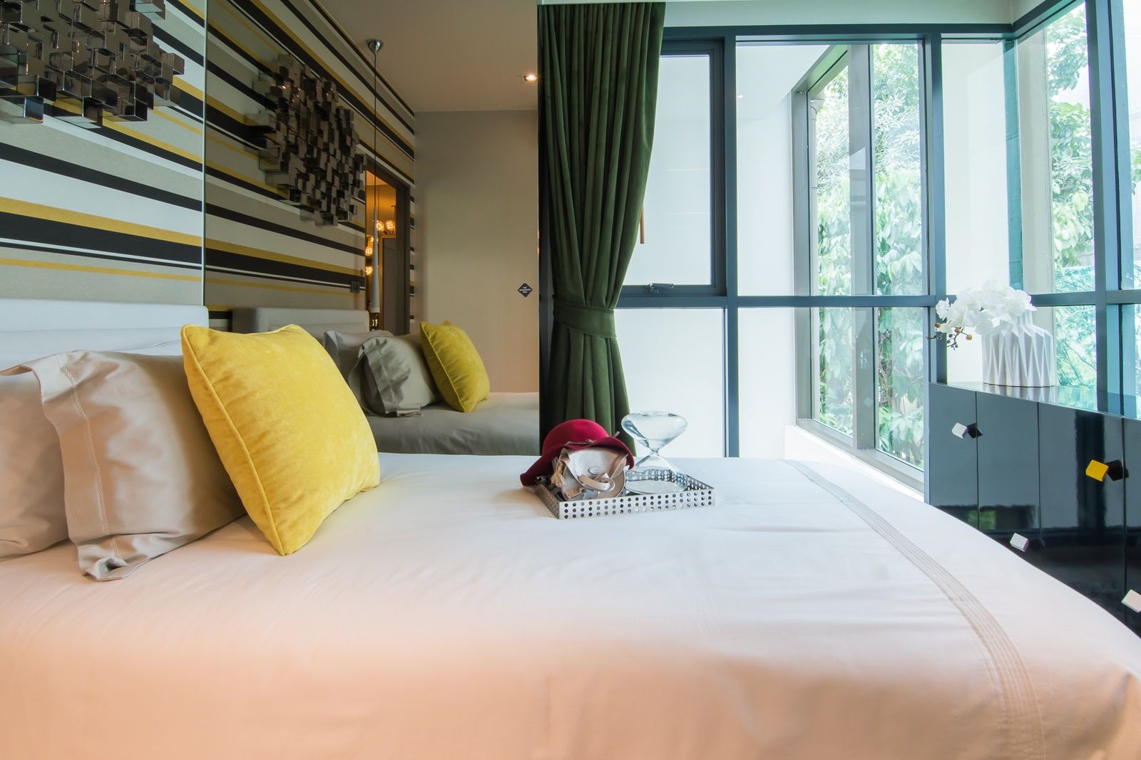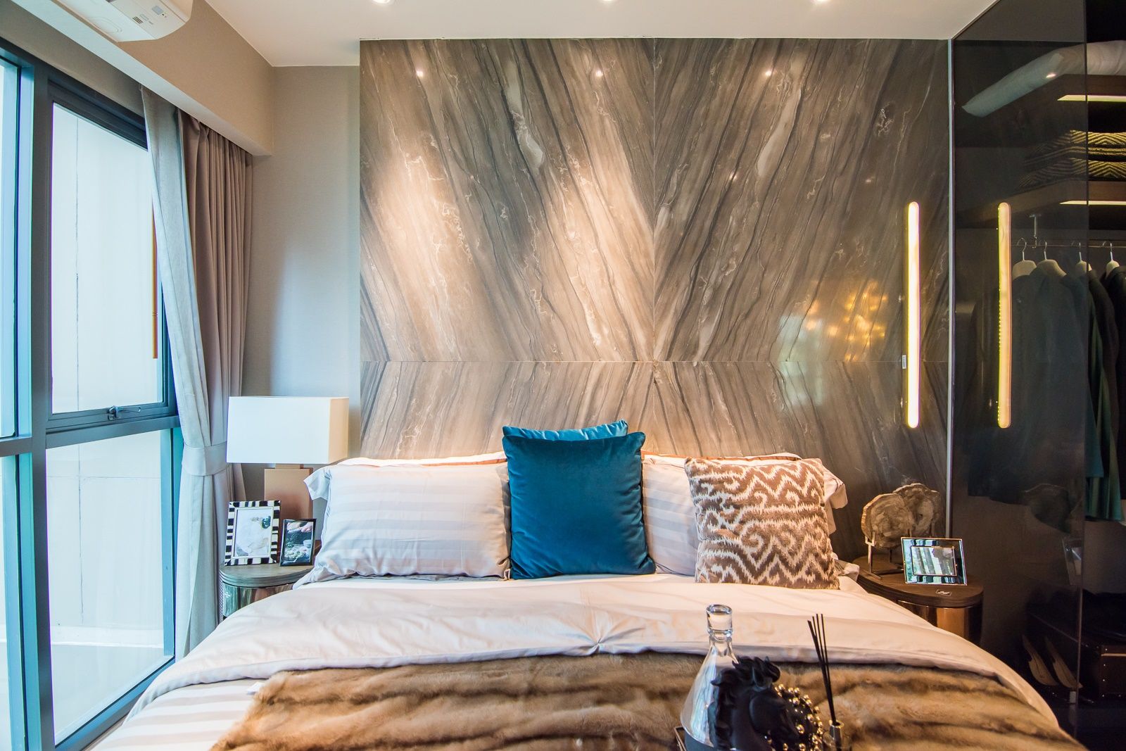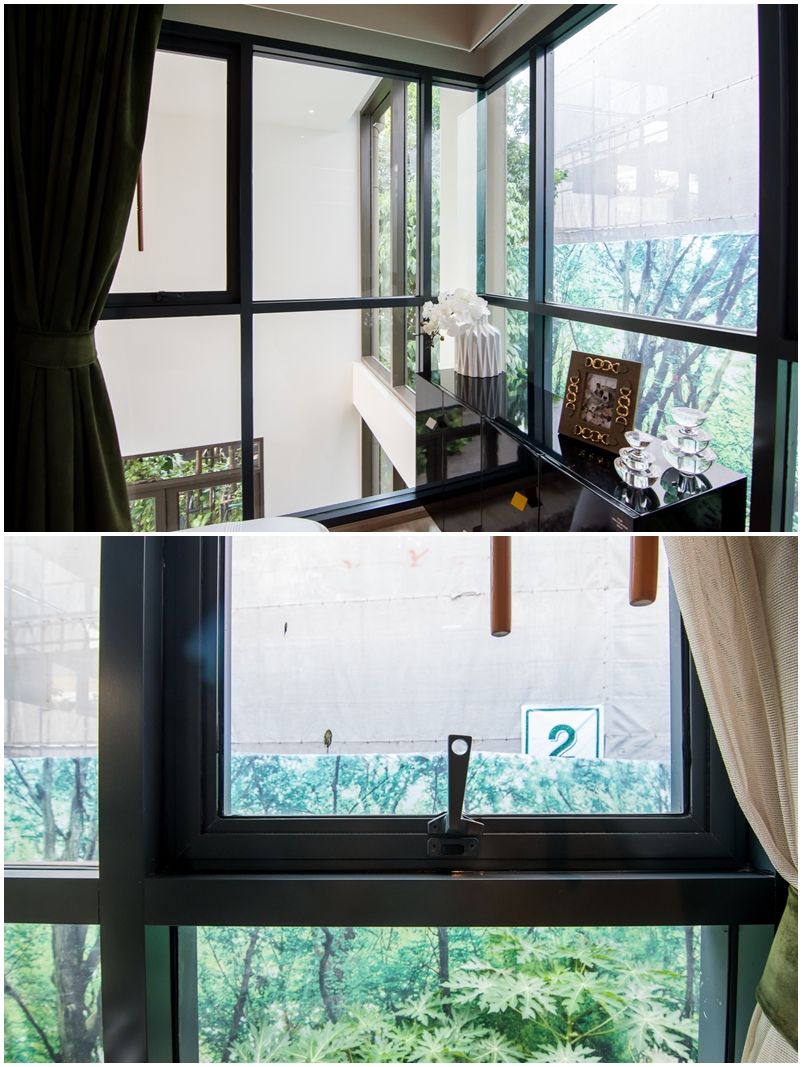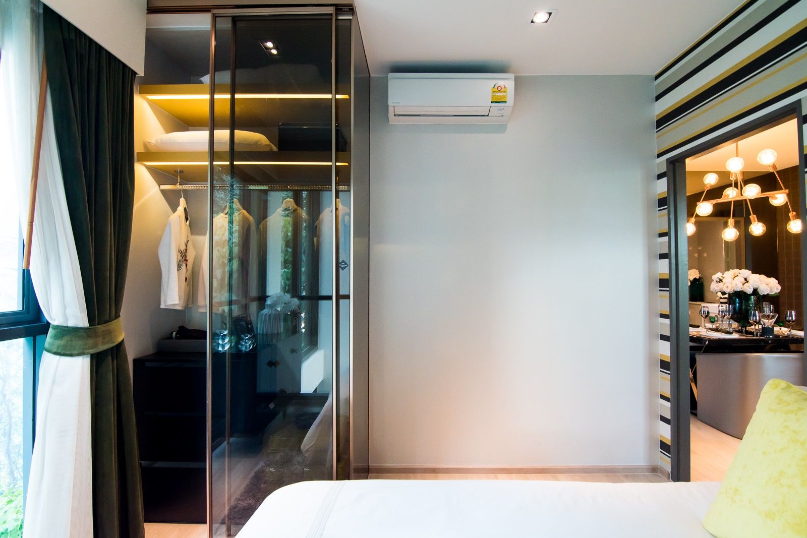 ริมสุดห้องกรุบานกระจกเต็มเนื้อผนัง เปิดโล่งเป็นช่องรับแสงจากธรรมชาติ