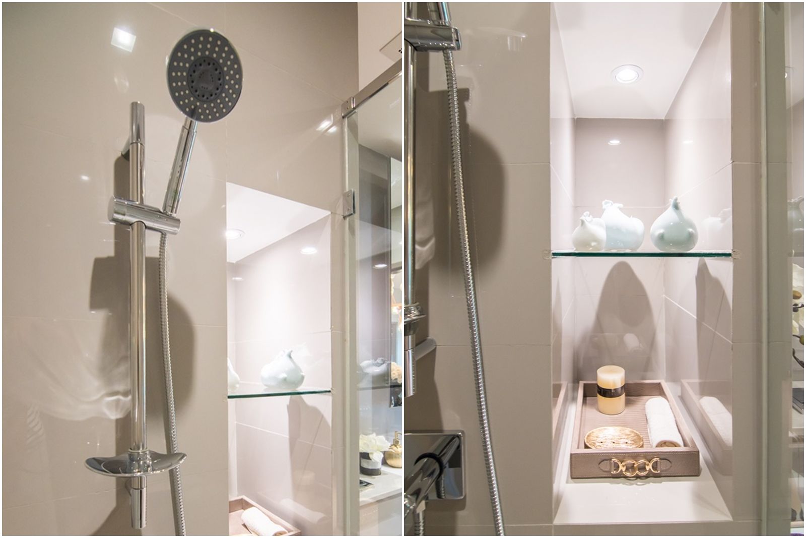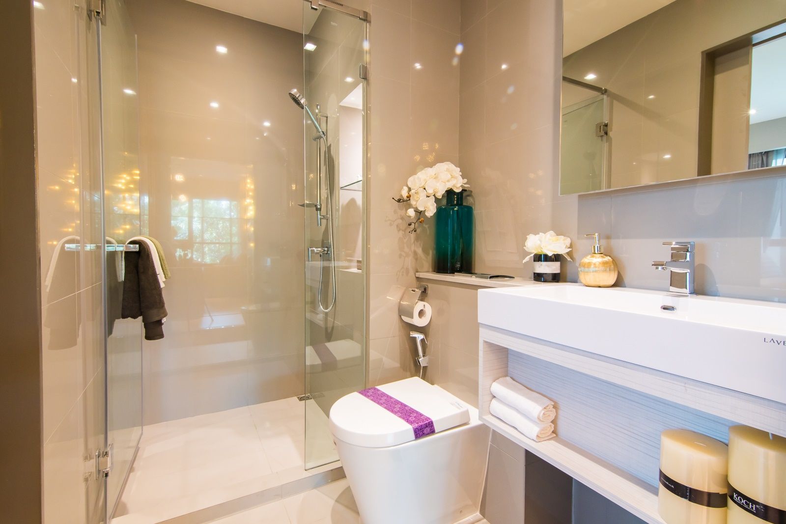 ห้องอาบน้ำระบบ Hand shower ฝักบัวใหญ่อาบได้สะใจ ที่วางของแบบ drop wall เข้าไปลึก ทำให้วางของได้เยอะ