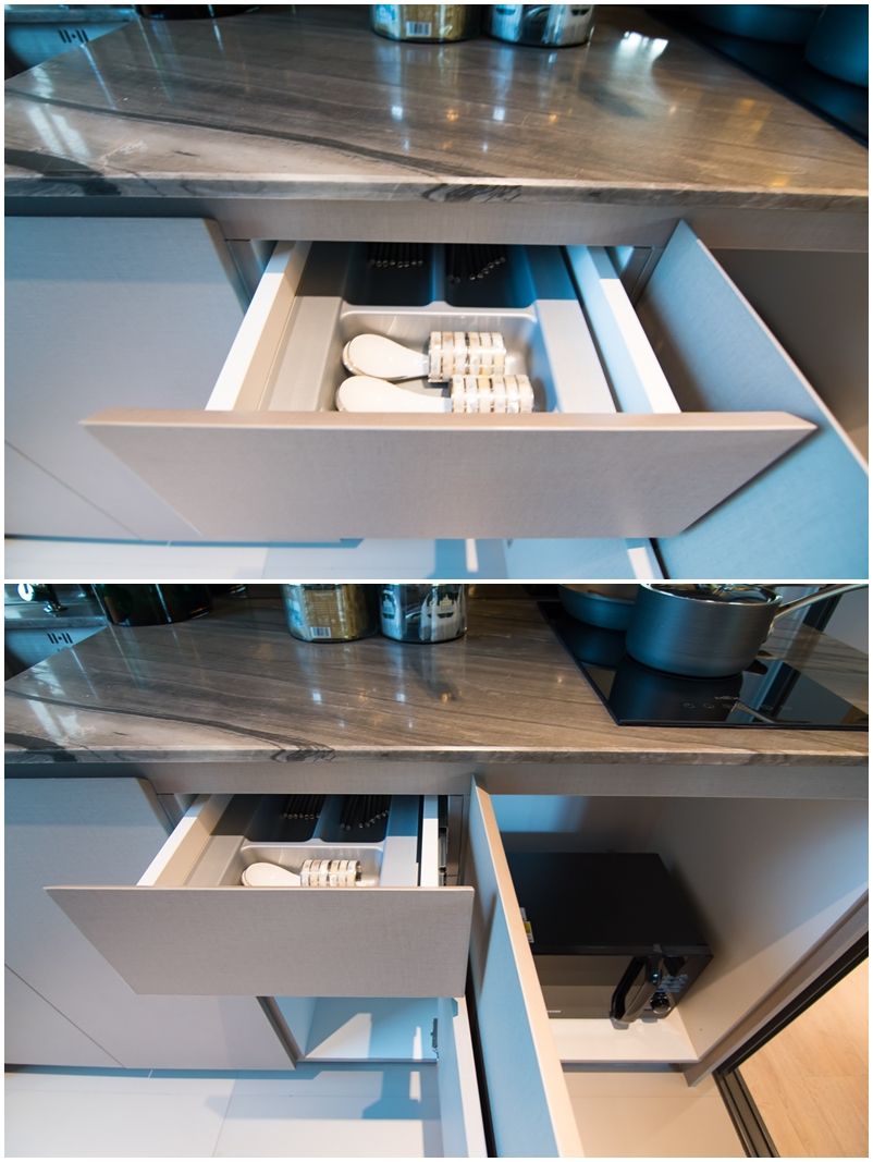 เคาน์เตอร์ด้านล่างมีองค์ประกอบเหมือนกับห้อง Type B บานลามิเนตเปิด-ปิดแบบ Softclose ที่วางไมโครเวฟจะย้ายมาไว้ในตู้แทน