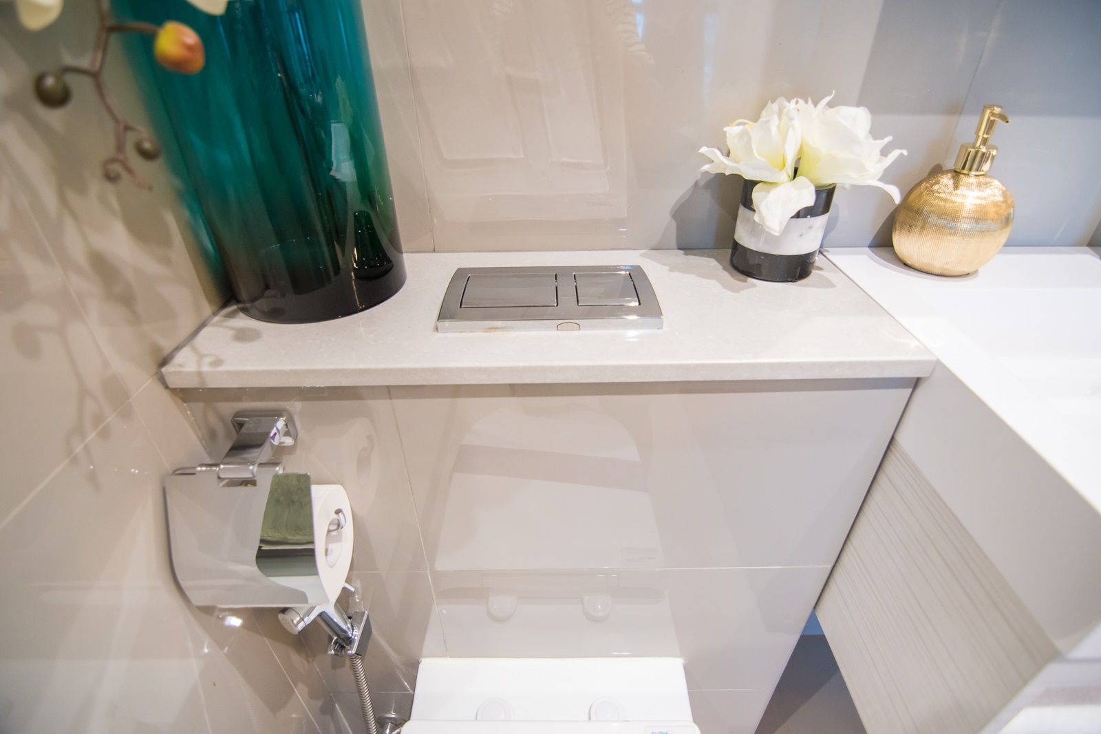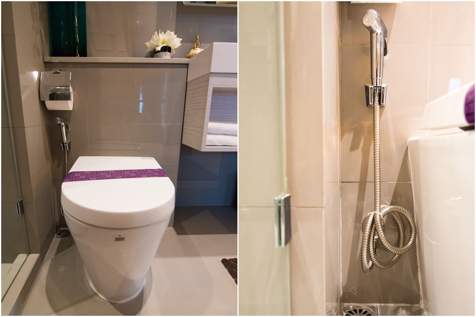 ห้องอาบน้ำของ Type C ก็ยังคงเป็นระบบ Hand shower อย่างเดียว สุขภัณฑ์จาก Englefield เช่นเดิม ด้านหลังทำช่องวางของแบบ dropwall เพื่อไม่ให้เปลืองเนื้อที่ ช่องค่อนข้างลึกวางของได้เยอะ