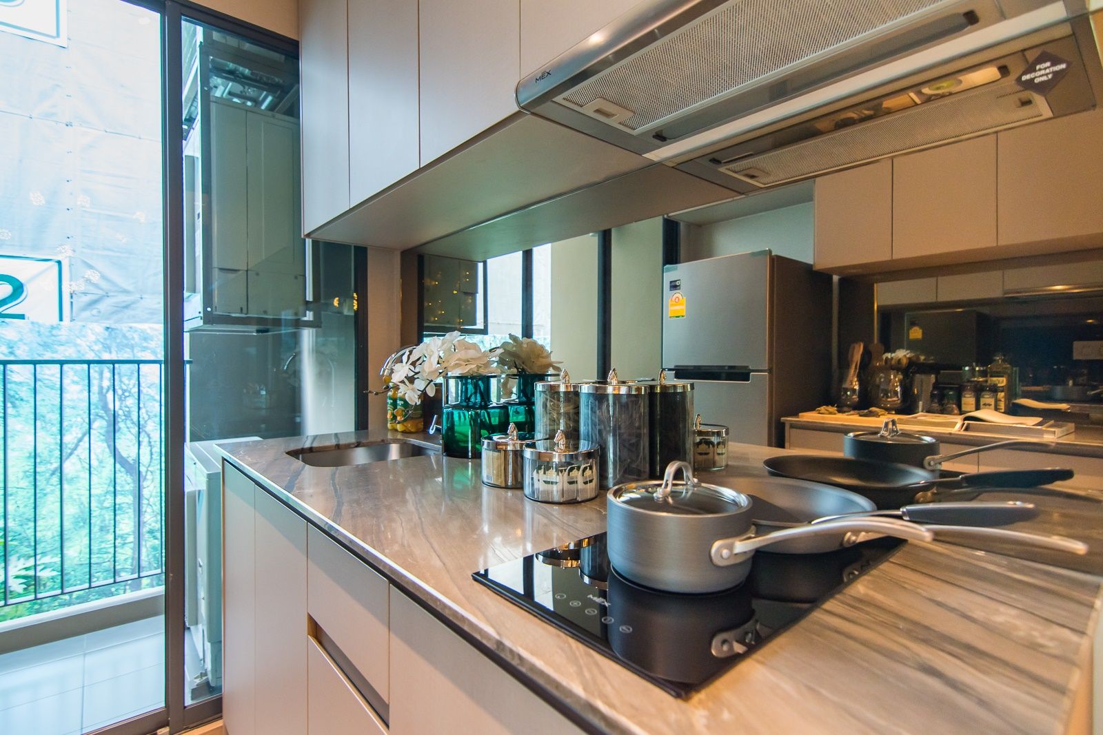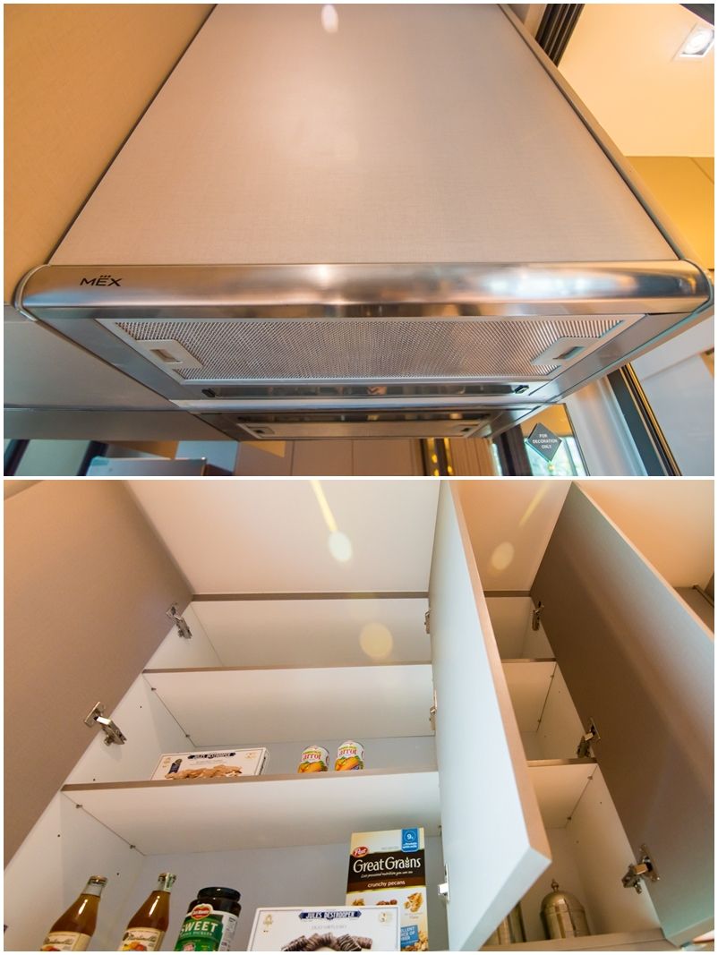ชั้นบนติดตั้งเครื่องดูดควัน MEX และตู้เก็บของ Built in ลามิเนตด้านบน บานเปิดปิด softclose