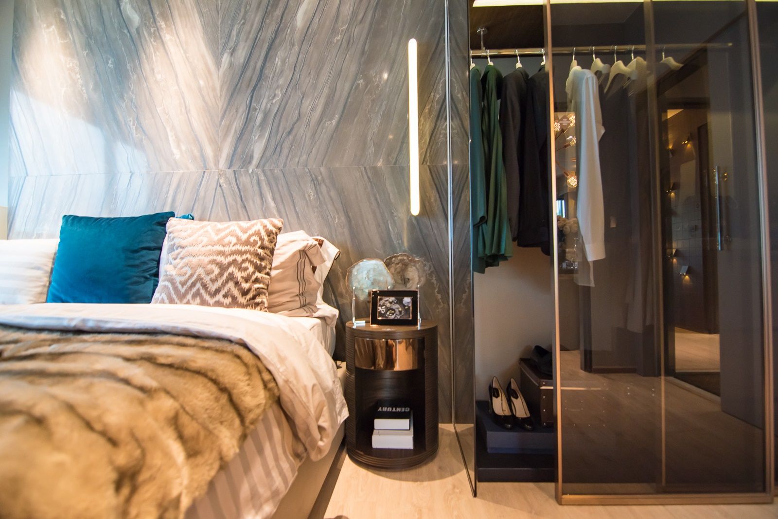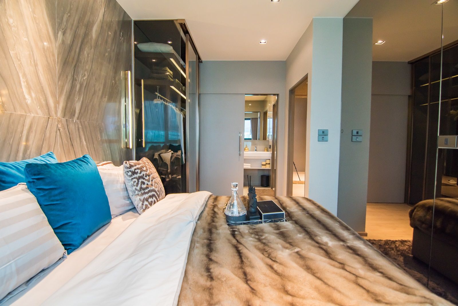 เนื่องจากห้อง Master Bedroom ค่อนข้างกว้างอยู่แล้ว จึง Built in ตู้เสื้อผ้าได้สบาย และยิ่งมีประตูเชื่อมกับห้องน้ำ ก็ยิ่งทำให้สะดวกในการแต่งตัวเข้าไปอีก