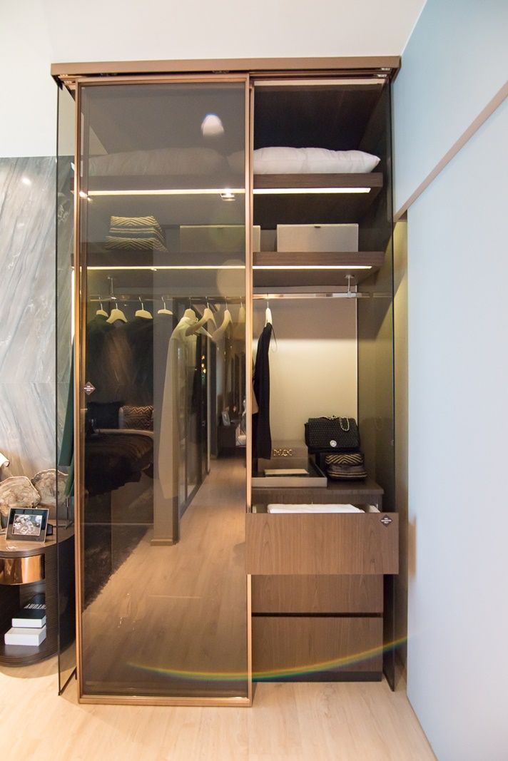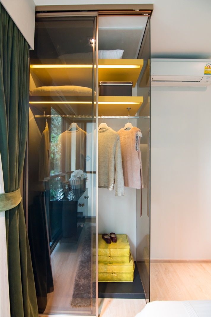 ตู้เสื้อผ้า Built in ที่คอนโด Whizdom Station รัชดา-ท่าพระ ใช้เป็นตู้บานเลื่อนกระจกสีชา สูงติดเพดาน ทำให้ได้พื้นที่เก็บของเยอะ