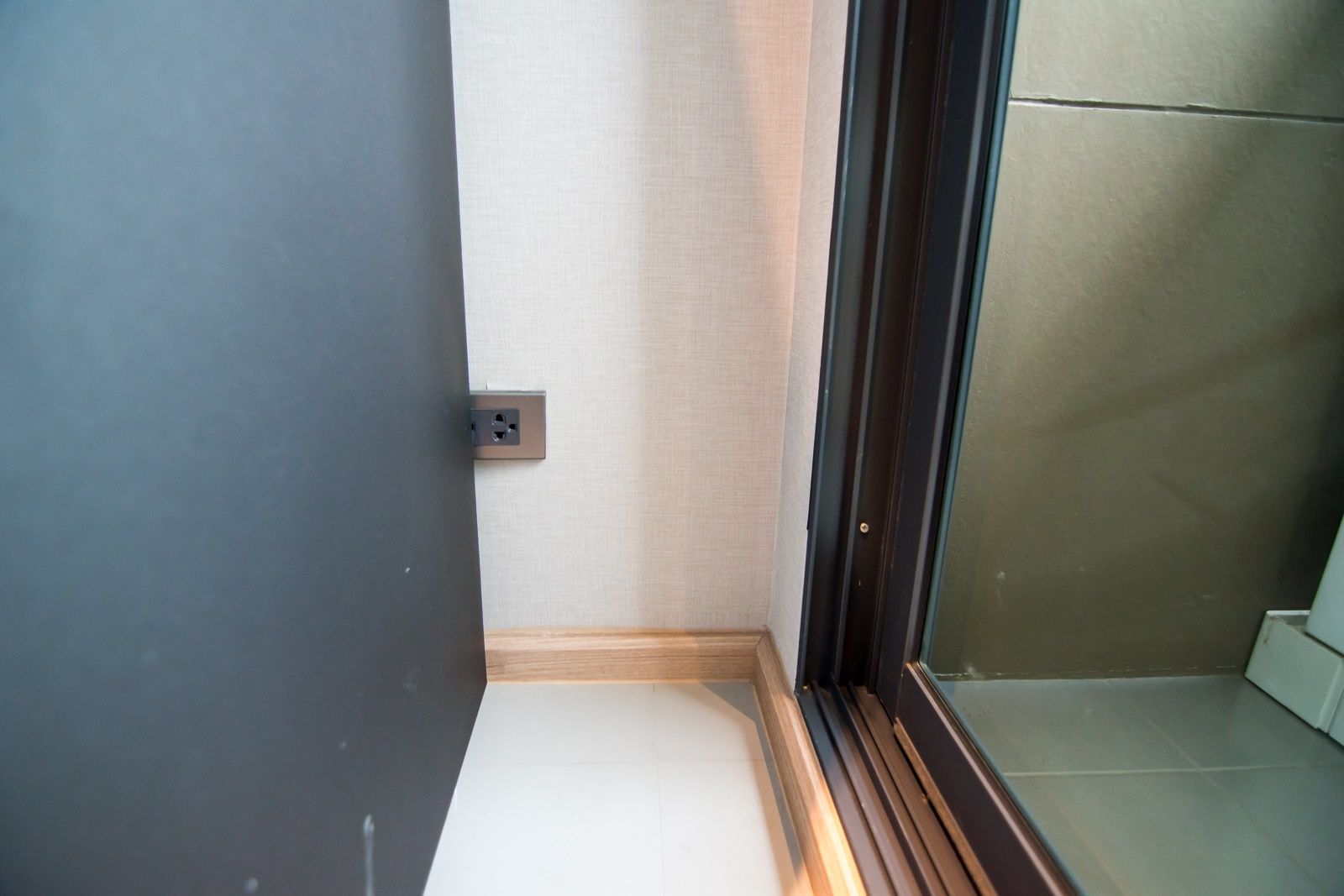 ระเบียงห้องเหมือนกับห้อง Type B แต่มีขนาดยาวกว่าตามไซส์ห้อง บานเลื่อนกระจกเปิด 3 ตอน กรอบอลูมิเนียมดำ ธรณียกสุง 2.5 นิ้ว