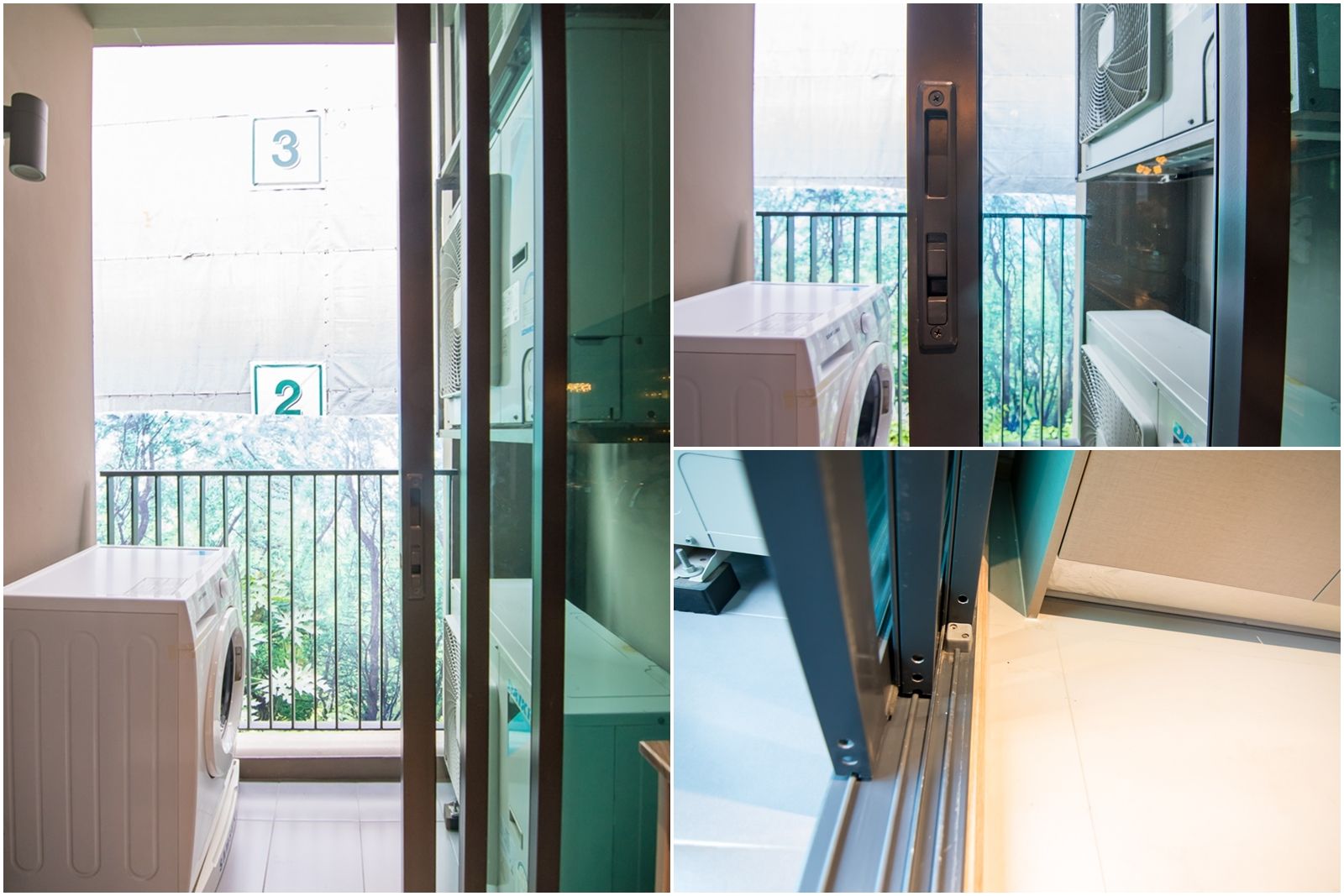ประตูระเบียงเป็นบานเลื่อน 3 ตอน ทำให้เลื่อนเปิดได้กว้าง กระจกสีเขียวตัดแสง กรอบอลูมิเนียม กลอนล็อกแบบเซาะร่อง