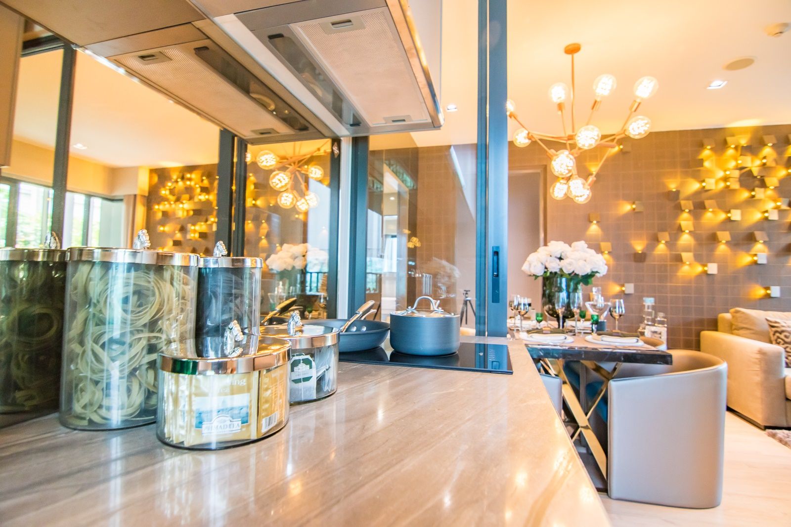 ชุด Pantry ครัว ตกแต่งเพิ่มเติมด้วย Top หินอ่อน ทำให้ห้องดูหรูหรายิ่งขึ้น แถมยังเสริมความแข็งแรงให้ทนทานต่อแรงกระแทก เช็ดทำความสะอาดง่าย ส่วนโต๊ะทานข้าวก็ Built in ติดกันเป็นตัวรูปตัวแอล (L) ไม่สามารถเคลื่อนย้ายและเพิ่มจำนวนที่นั่งได้