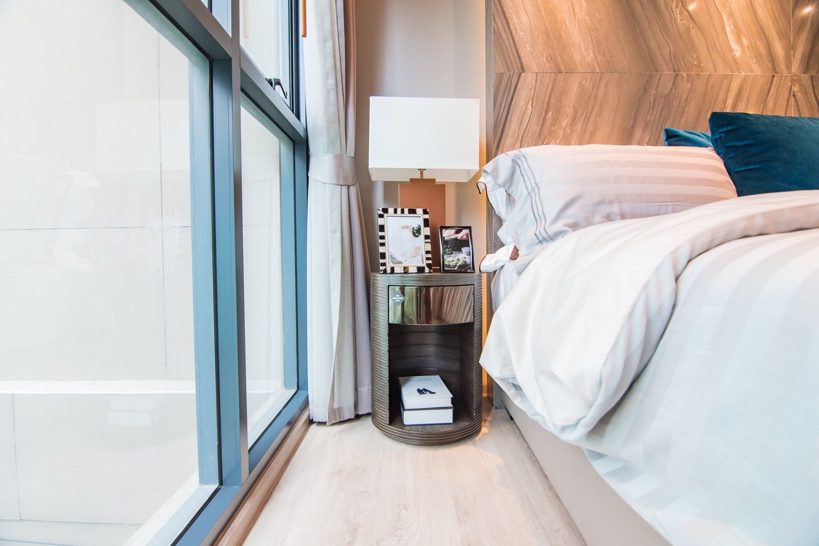 ริมหน้าต่างกว้าง 60 เซนติเมตร สามารถตั้งโต๊ะข้างเตียงไซส์เหมือนห้องตัวอย่างได้