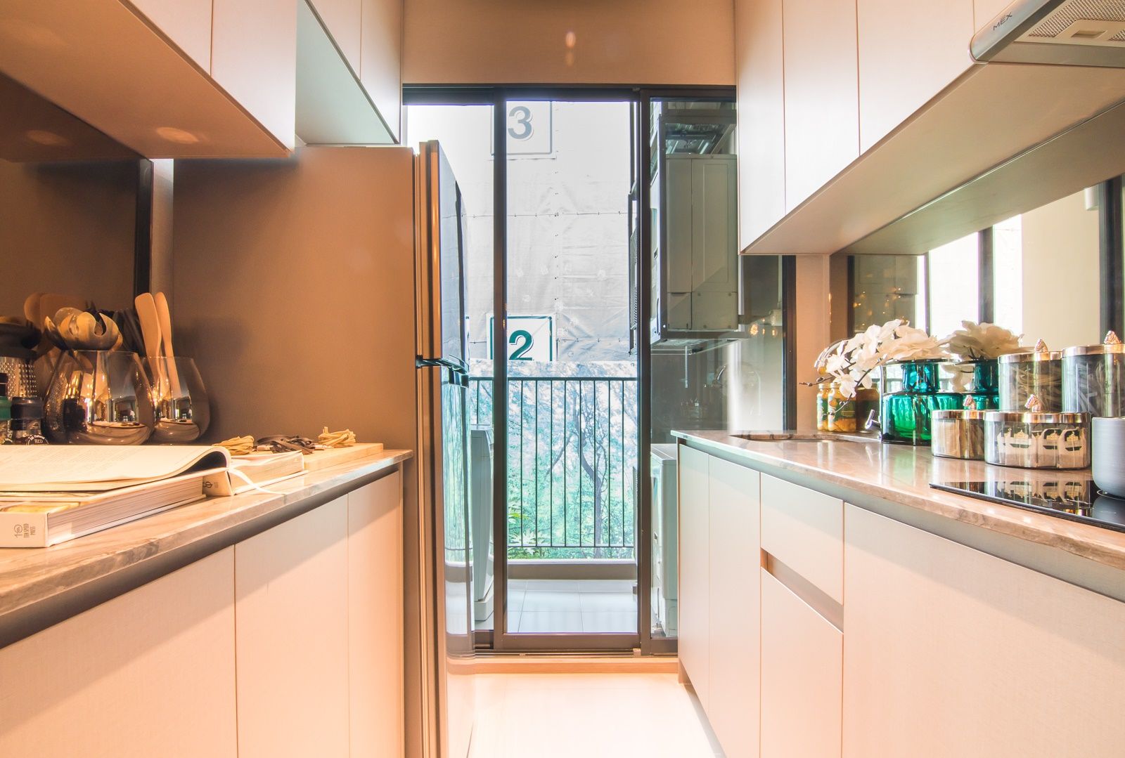 ห้องครัวตั้งกลางระหว่าง 2 ห้องนอน มีพื้นที่ประกอบอาหารและเก็บอุปกรณ์เยอะ น่าจะถูกใจคนที่ชอบอาหารทานเองที่ห้อง อีกทั้งยังเป็นครัวปิดและเชื่อมกับระเบียง จึงช่วยเรื่องการระบายกลิ่นควันได้ดียิ่งขึ้น แต่ถ้าคนในห้องมีนาฬิกาชีวิตต่างกัน ต้องดูวัสดุว่าเป็นผนังเก็บเสียงรึป่าว ไม่งั้นตอนดึกๆ อาจได้ยินเสียงทำอาหารคอยรบกวนเวลานอนแน่ๆ