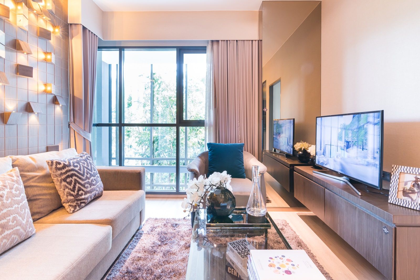 ระยะห่างระหว่างโซฟาและชั้นวางทีวีกว้างเกือบ 3 เมตร สามารถติดโทรทัศน์ขนาดใหญ่ได้ และหากยกโต๊ะกลางออก ก็จะได้พื้นที่ใช้สอยไว้ทำกิจกรรมต่างๆ ได้สะดวกขึ้น