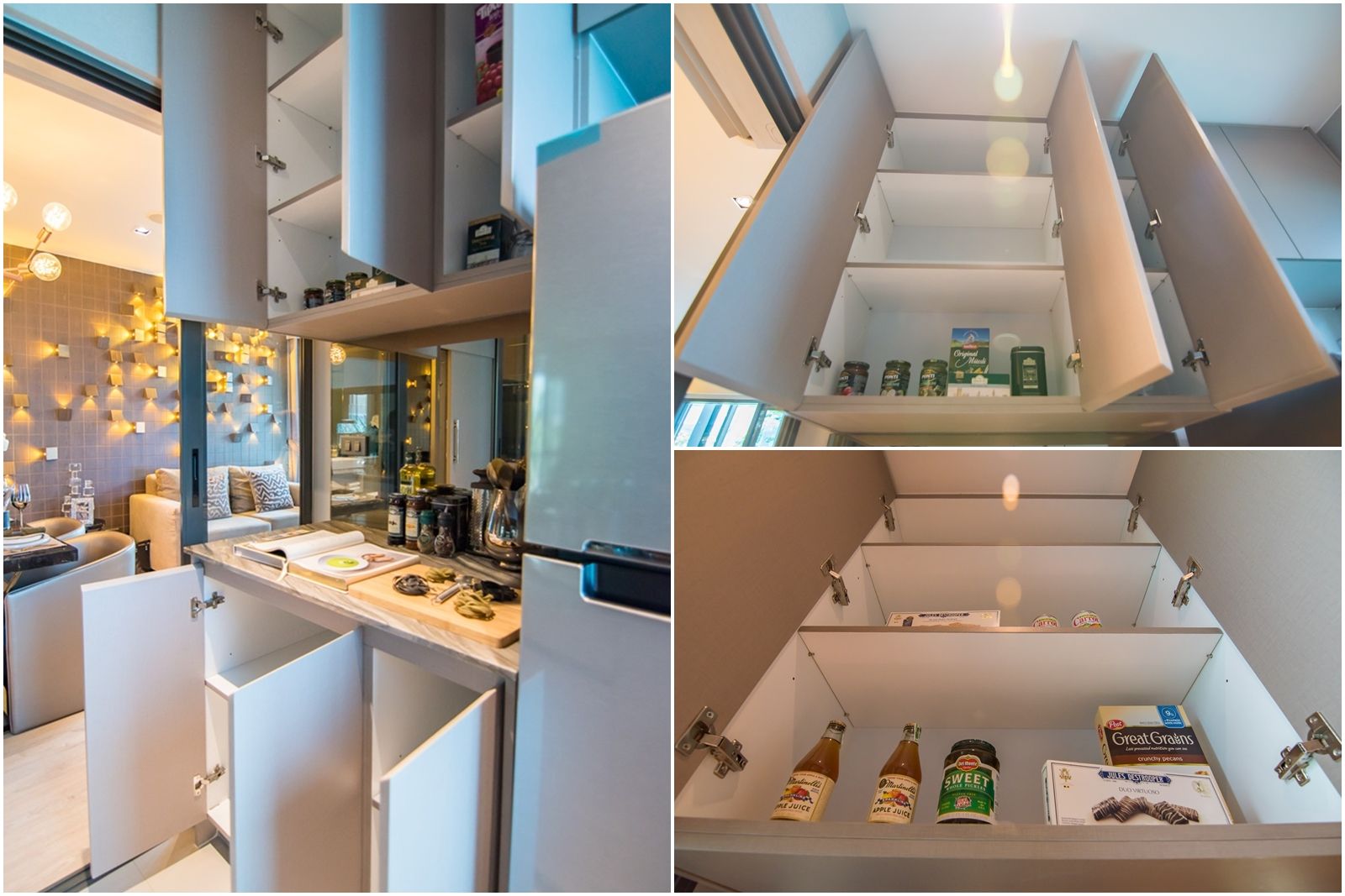 มีชั้นเก็บของทั้งบนและล่าง แต่ตู้ที่อยู่หลังตู้เย็นจะอยู่สูงกว่าเพื่อน ใช้งานลำบากต้องเอื้อมเขย่ง จึงไม่ควรเก็บพวกแก้ว จานชามกระเบื้อง ของที่แตกหักง่ายไว้ตรงนี้ เพื่อป้องกันอุบัติเหตุที่อาจเกิดขึ้นได้ ริมสุดเป็นที่ว่างใช้วางตู้เย็นขนาด 9.1 คิว